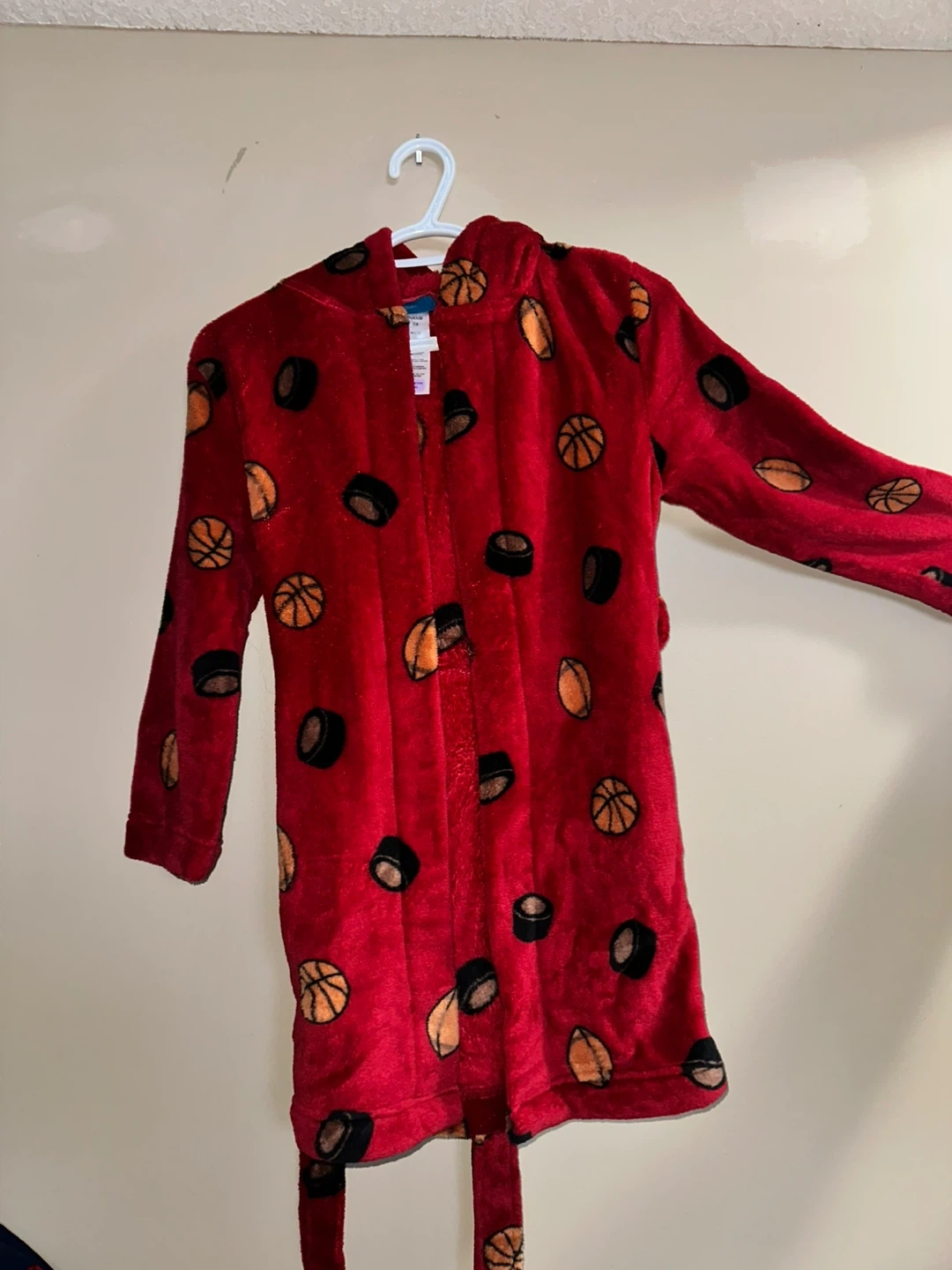 Kids' red plush robe with a sports theme featuring basketballs, footballs, and hockey pucks. It's made from 100% polyester for cozy comfort. This robe would be great for lounging around the house after a bath or on a chilly morning!