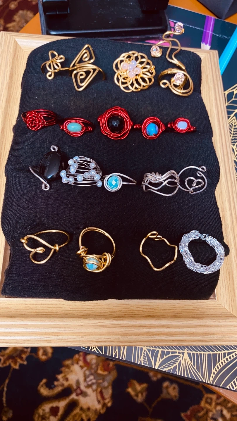 A collection of unique wire-wrapped rings in various colours and designs. It also includes a set of metallic pencils for creative projects. This set would be fun for an artist or crafter!