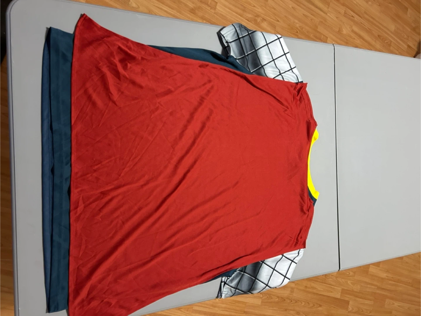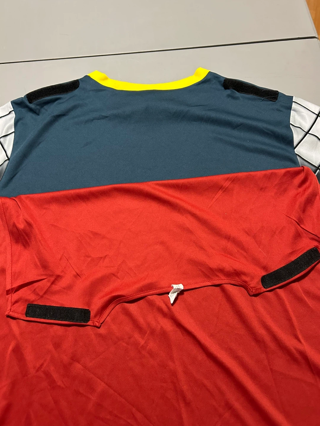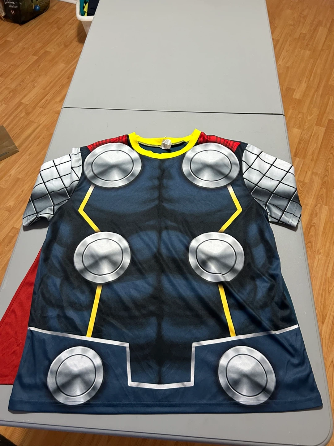 Adults’ Thor costume t-shirt with a printed design. It comes with a detachable red cape. The shirt has hook and loop fasteners on the back.