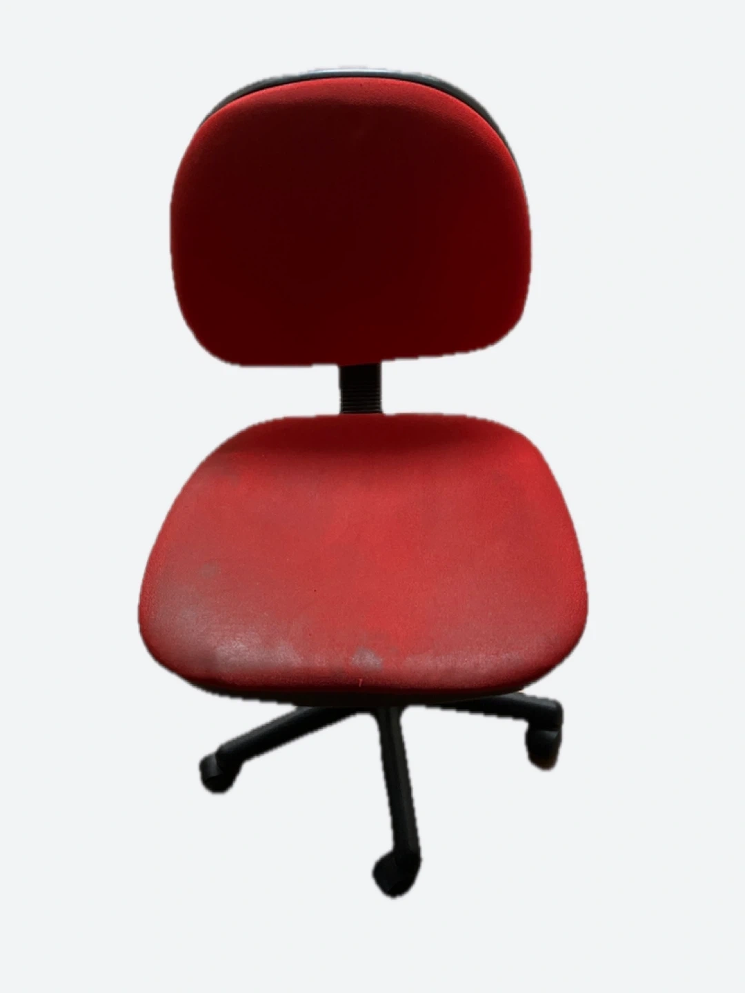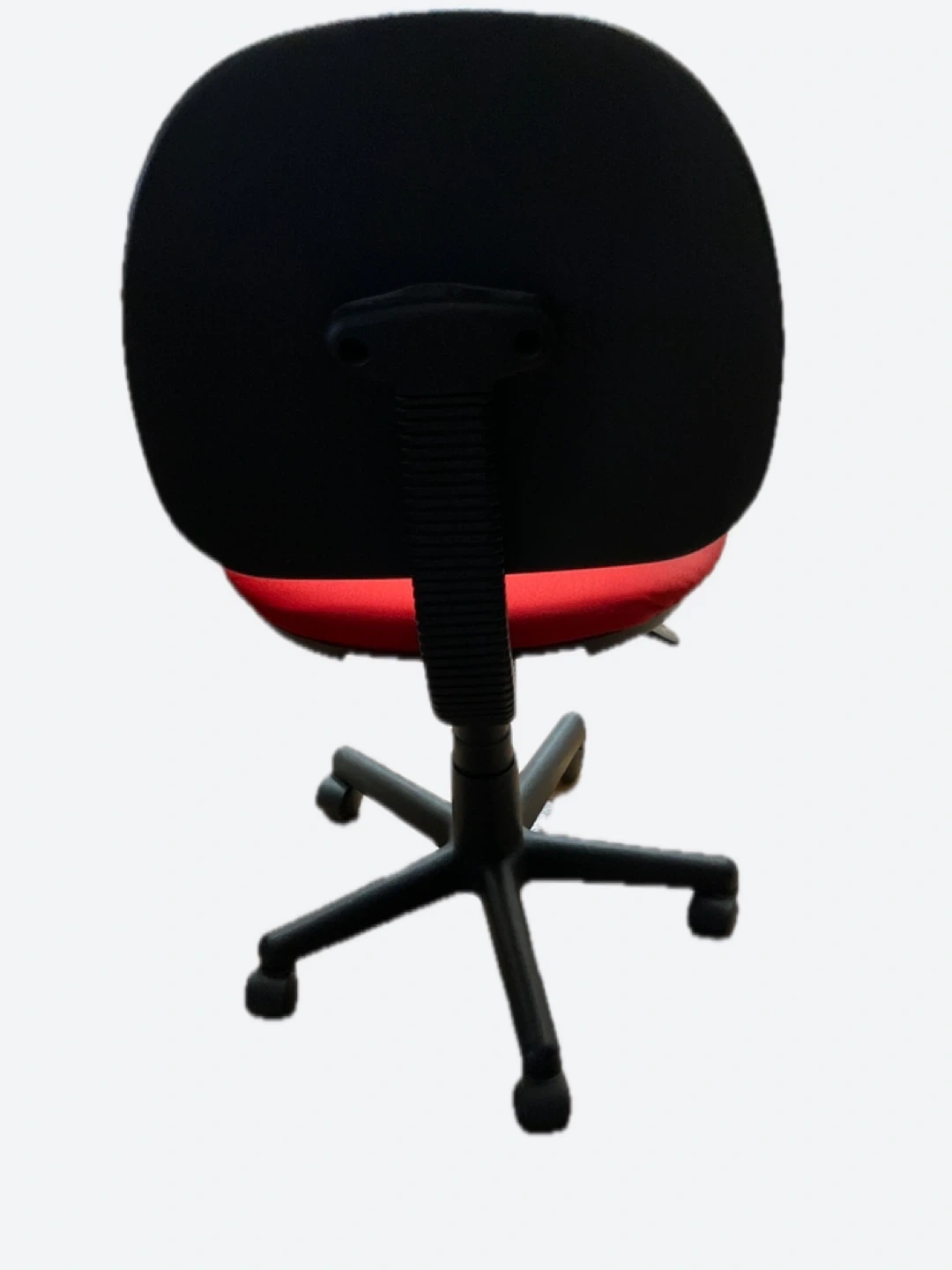 This is a red fabric office chair with a black base and wheels. It's suitable for a desk setup. The chair offers basic ergonomic support for comfortable seating.