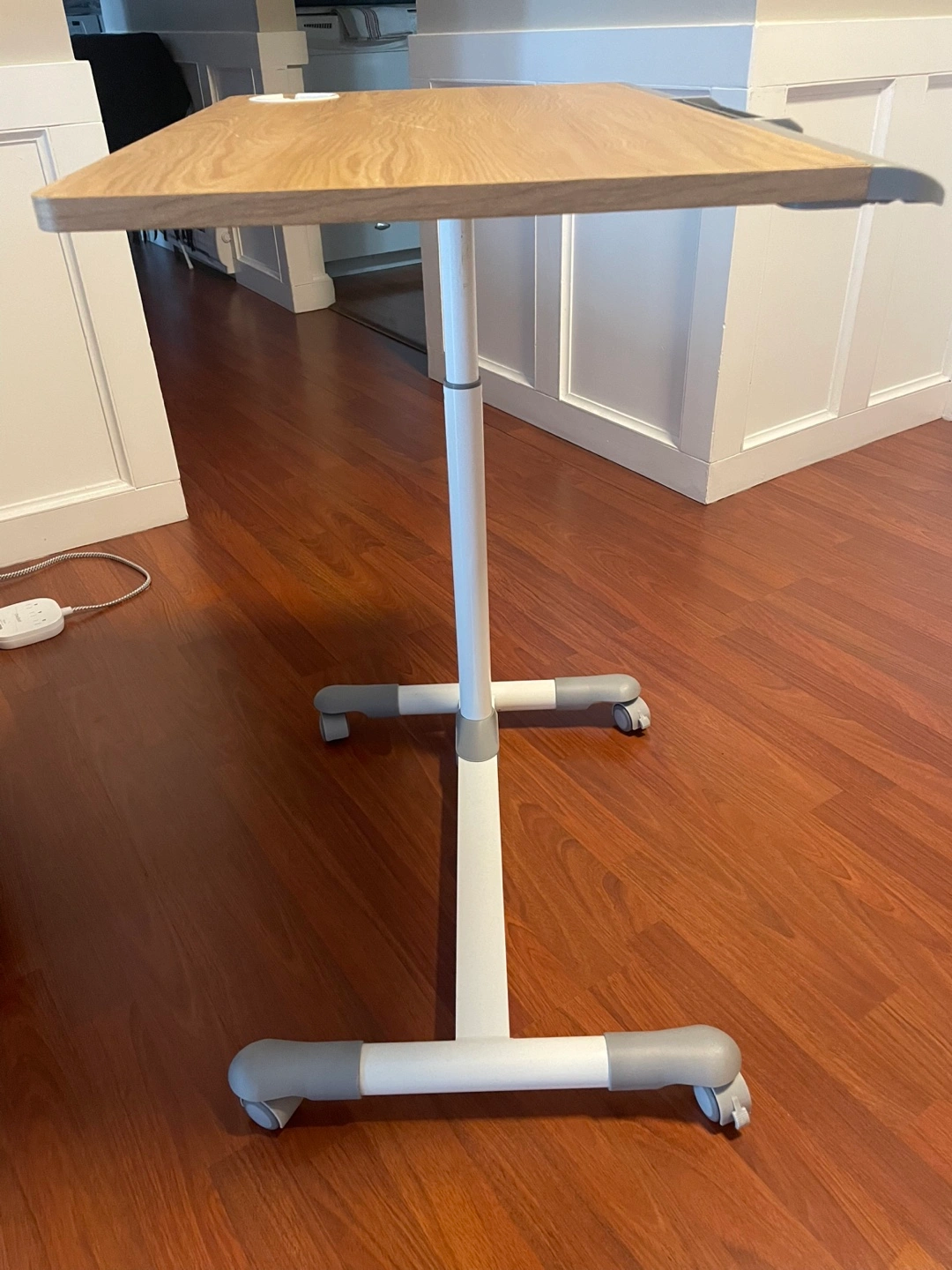 This portable rolling desk features a light wood-tone surface and a white metal frame. It's designed for easy mobility with four wheels.