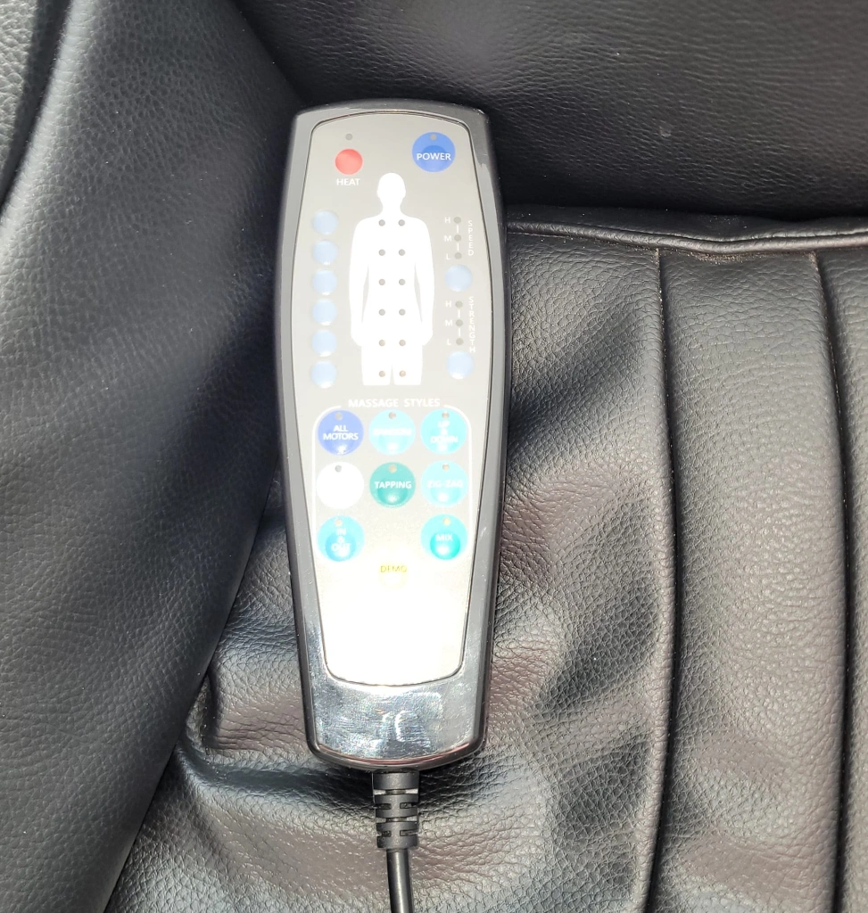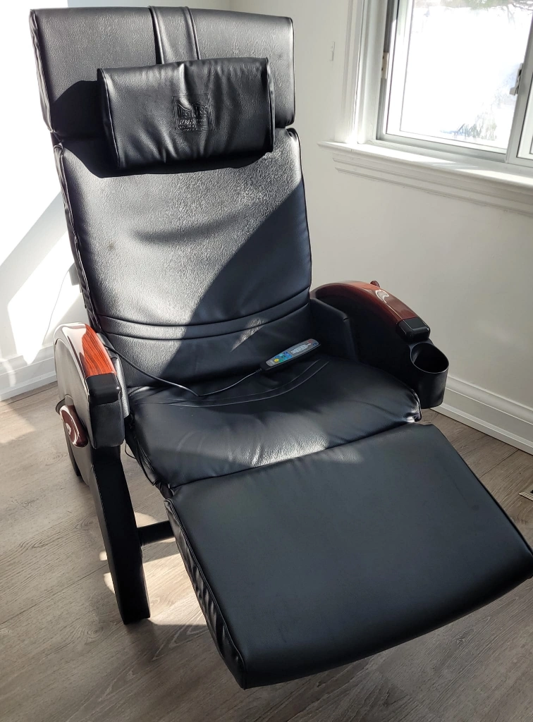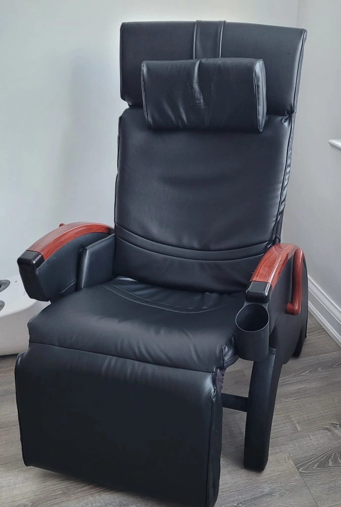 Black leather Inada massage chair with wood accents. It reclines and includes a footrest. The chair has a built-in cup holder. It's great for relaxation.