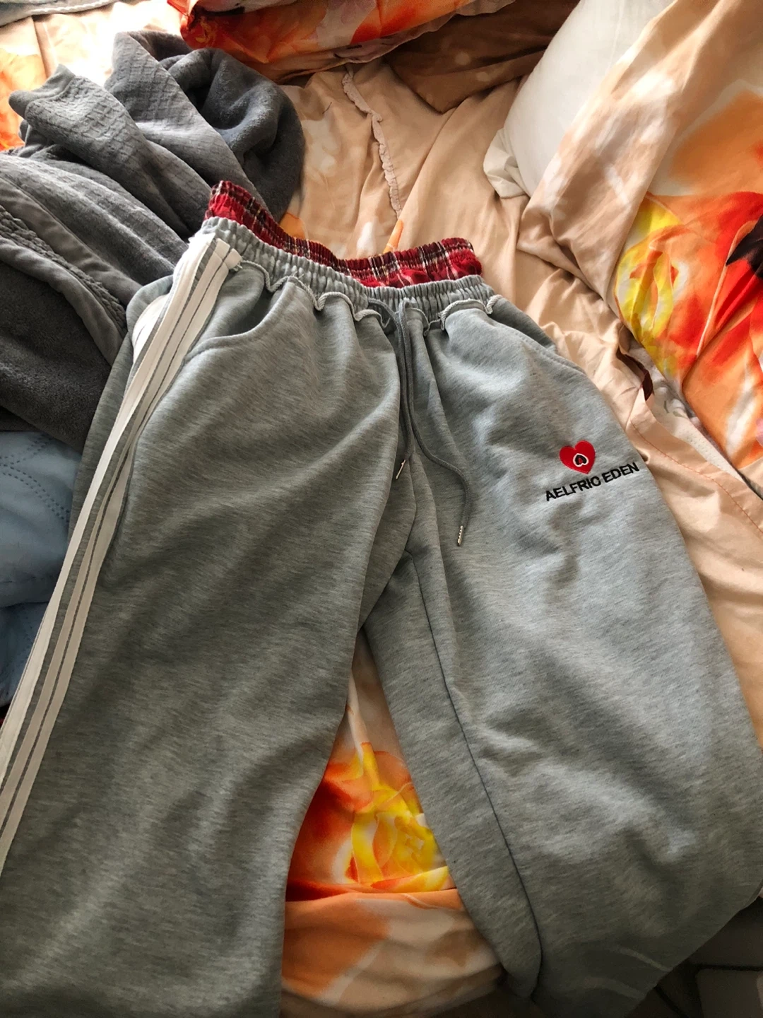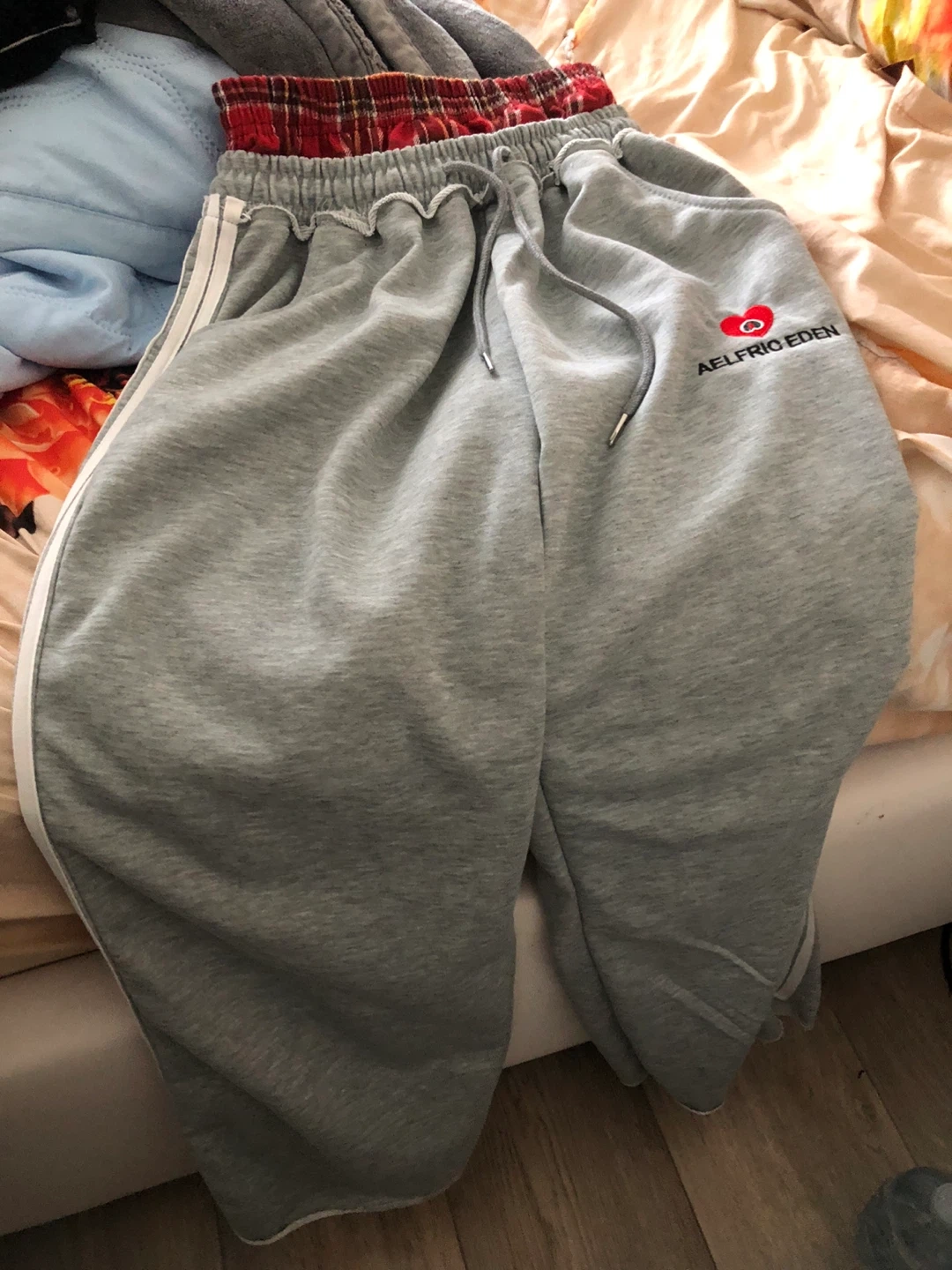 These are Aelfric Eden grey sweatpants with a red plaid elastic waistband. They feature white stripes down the sides and a drawstring closure. Made from a soft fleece-like material.