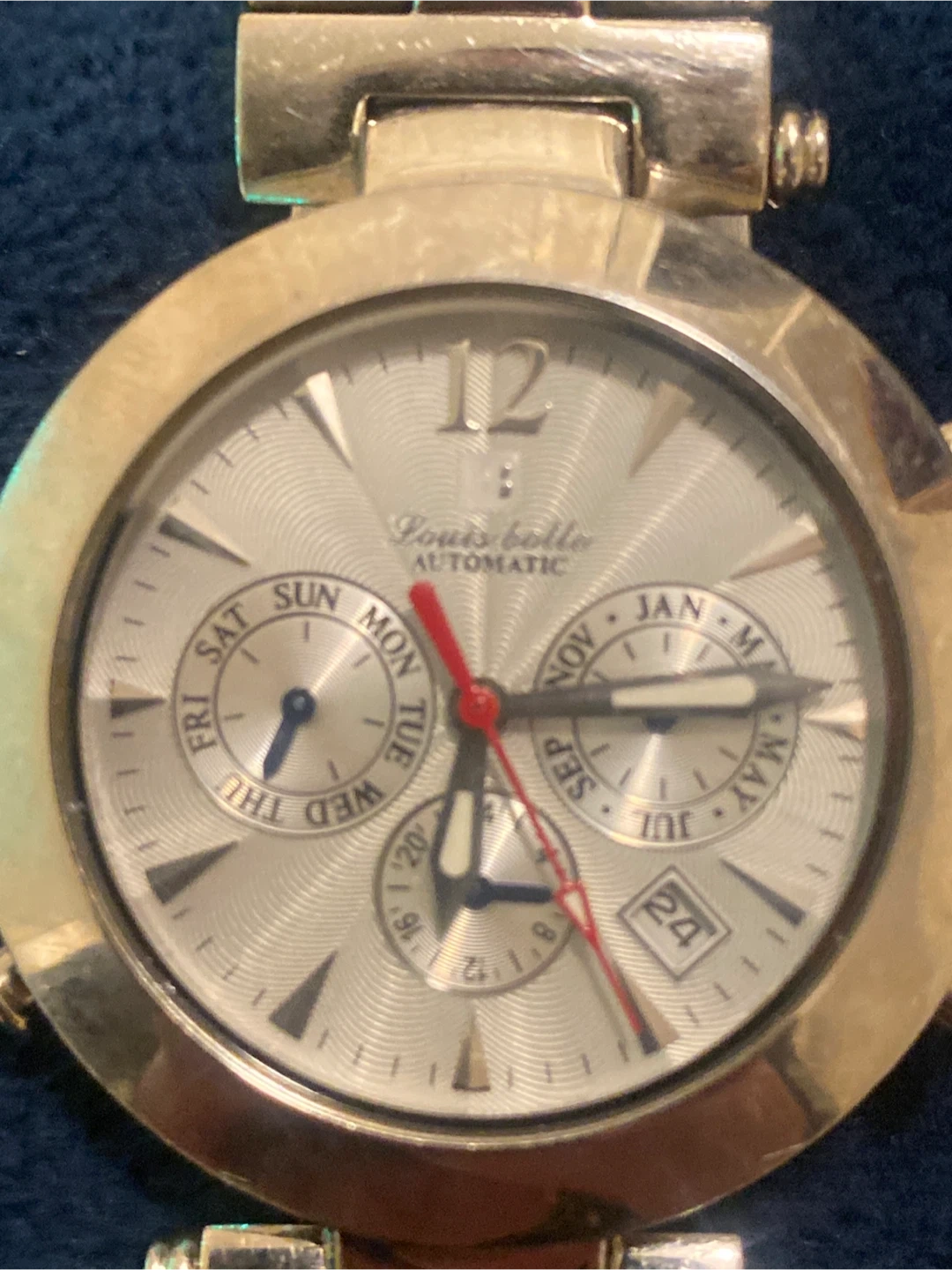 This is a Louis Belle automatic watch with a silver dial. It features subdials for day and month, and a date window. The case and band are made of stainless steel. It's a durable and stylish timepiece for everyday wear.
