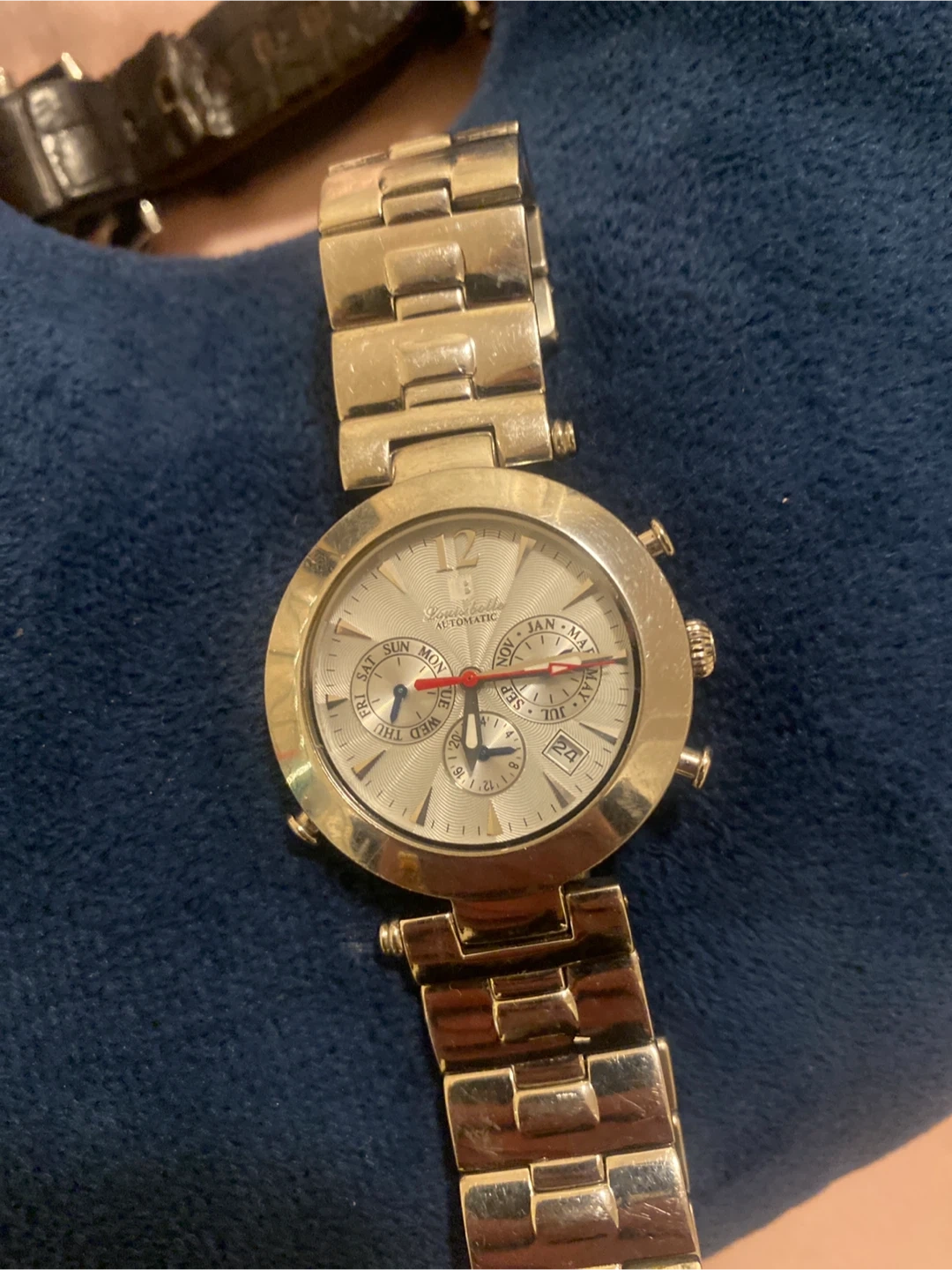 This is a Louis Belle automatic watch with a silver dial. It features subdials for day and month, and a date window. The case and band are made of stainless steel. It's a durable and stylish timepiece for everyday wear.