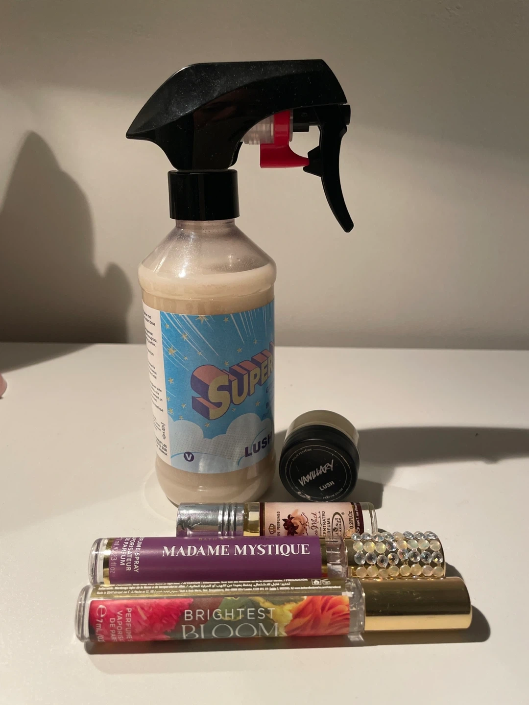 This is a collection of Lush "Super" body spray, "Vanillary” solid perfume, and two perfumes: "Madame Mystique", "Brightest Bloom". The body spray is in a 250ml bottle.