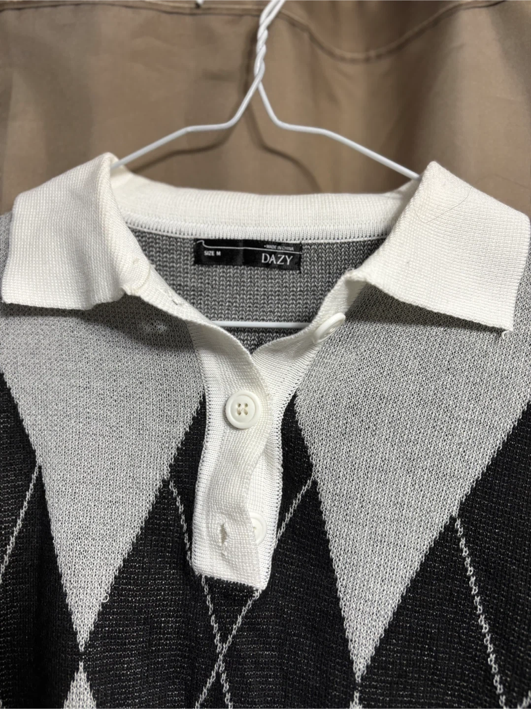 This DAZY cropped polo sweater features a classic argyle pattern. It's a size medium with long sleeves and a button-up neckline. The material is a soft knit, perfect for layering or wearing on its own.