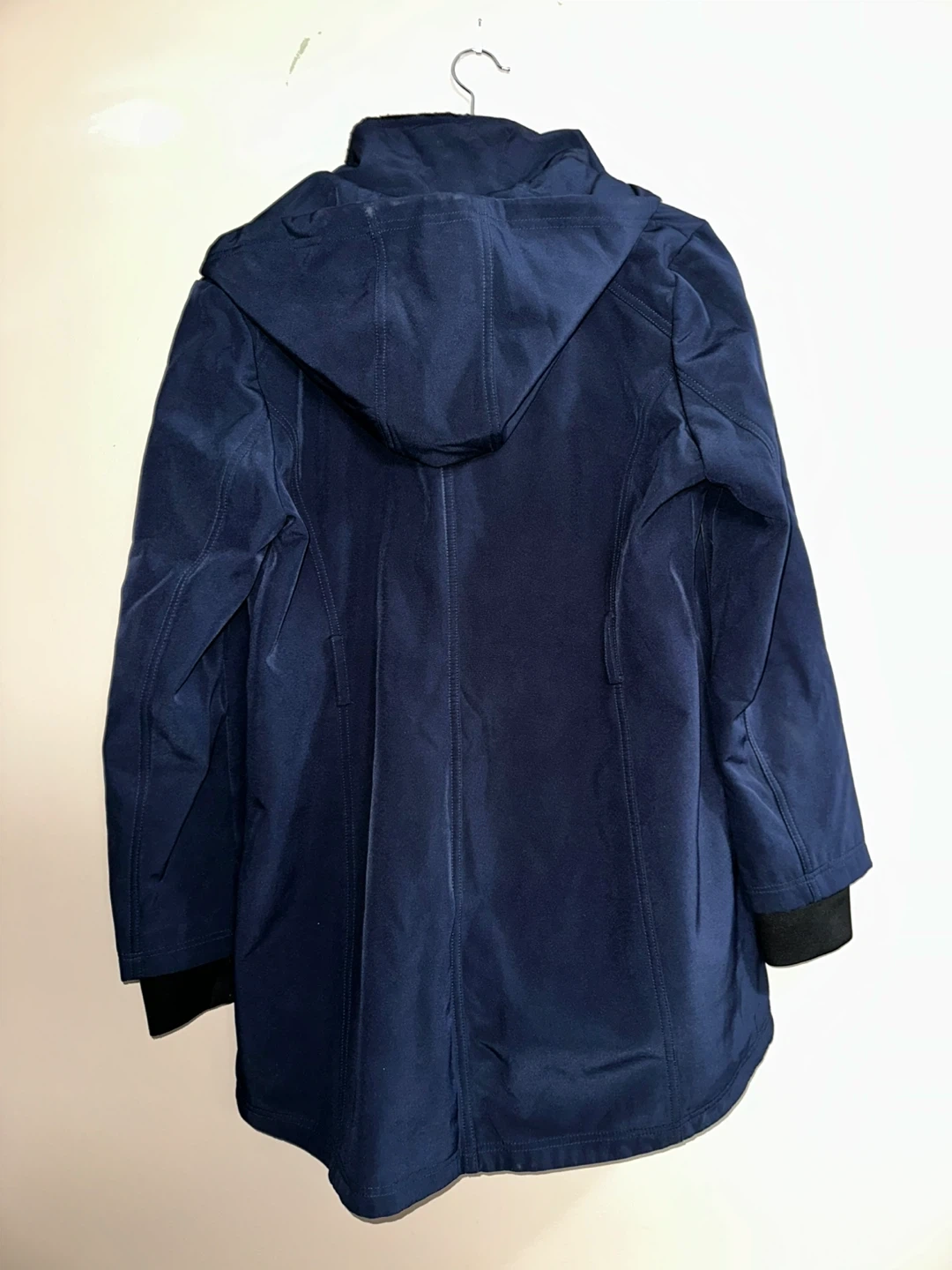 This navy blue parka features a cozy faux fur-lined hood and a warm interior. It's designed for colder weather with its durable construction. This jacket is great for staying warm during chilly days!