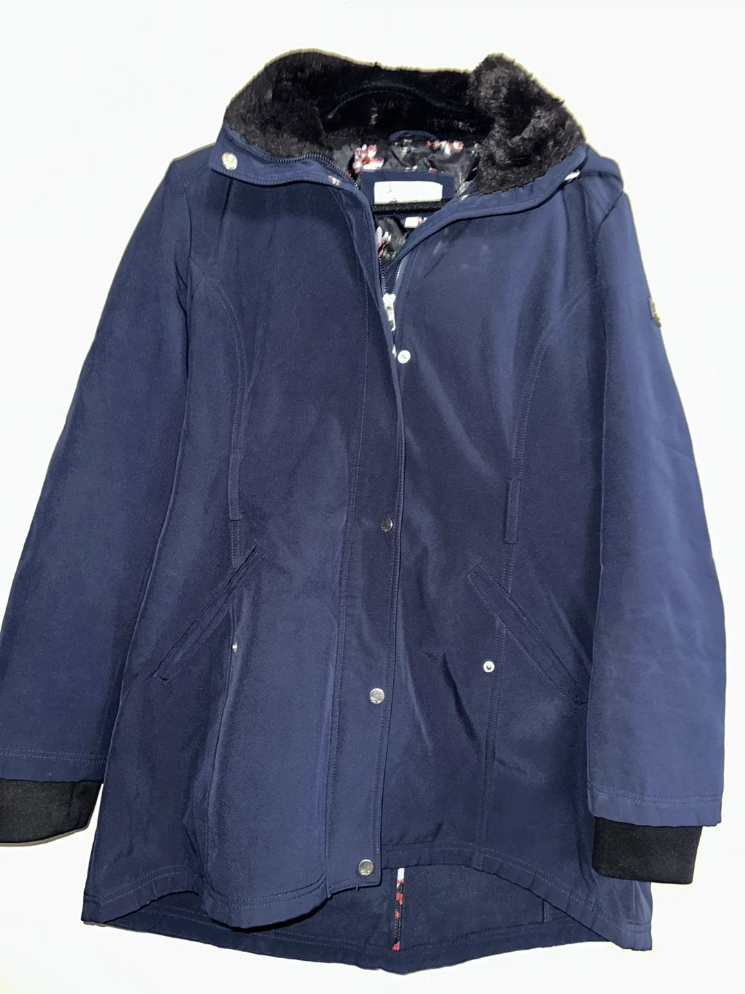 This navy blue parka features a cozy faux fur-lined hood and a warm interior. It's designed for colder weather with its durable construction. This jacket is great for staying warm during chilly days!