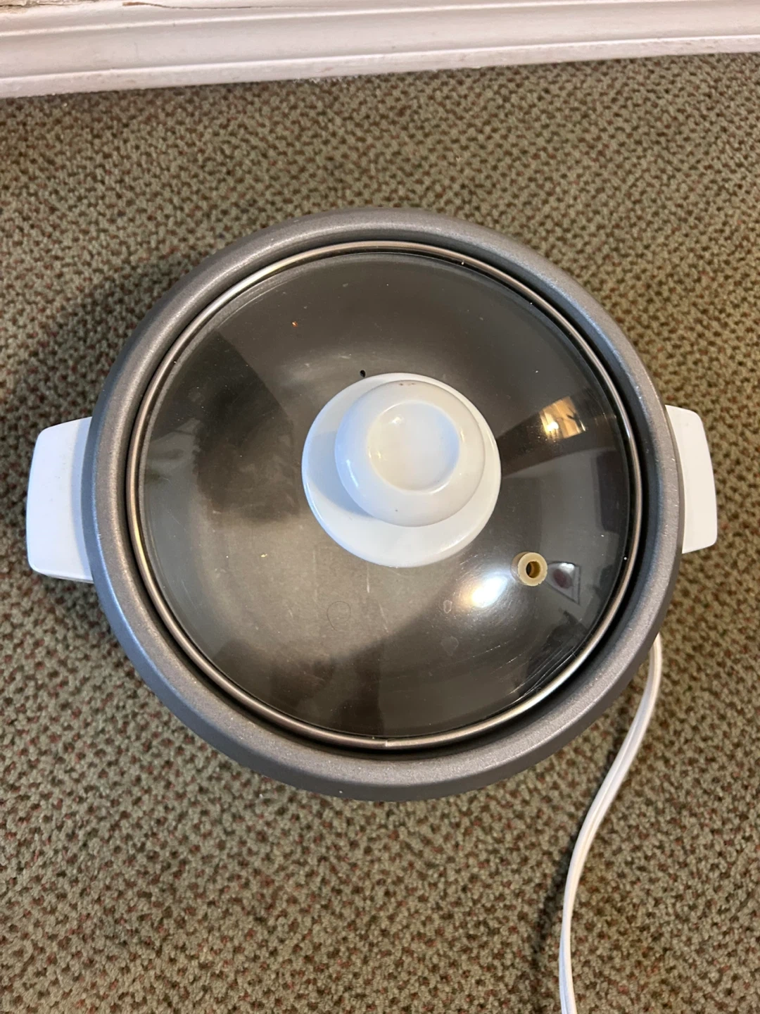 White Salton electric rice cooker with a glass lid. It has a "cook" and "off" setting. Easy to use for simple meals. It's a handy appliance for any kitchen!
