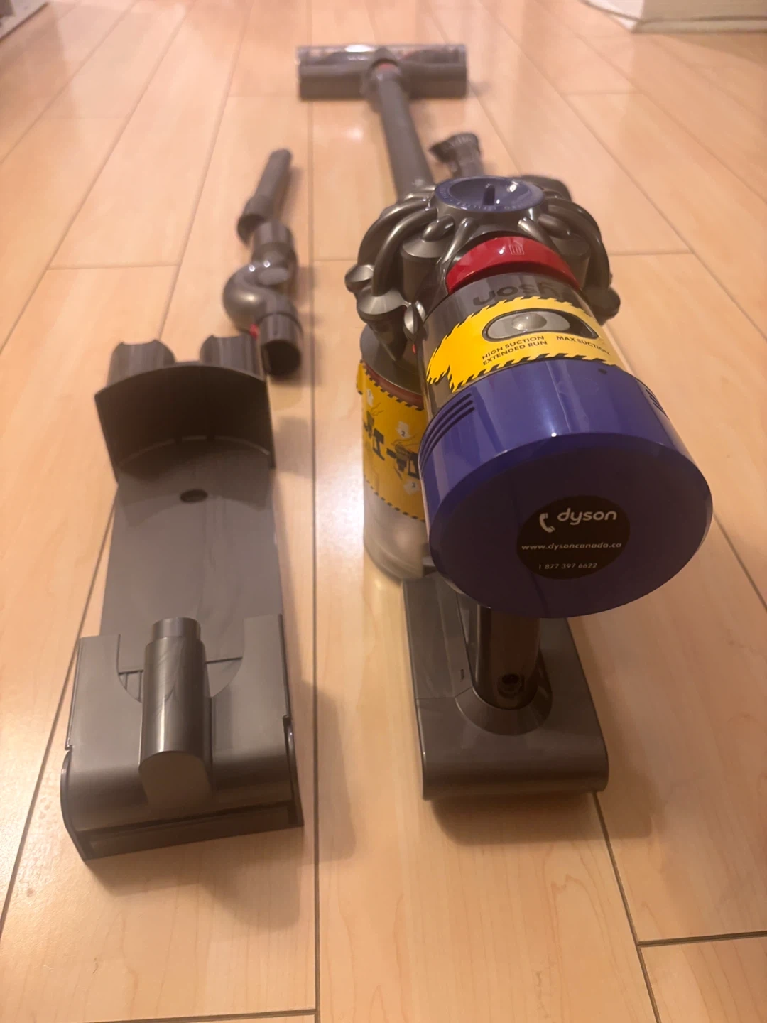 This is a Dyson cordless vacuum cleaner, grey and purple. It comes with several attachments and a charging dock. It's a powerful tool for cleaning your home!