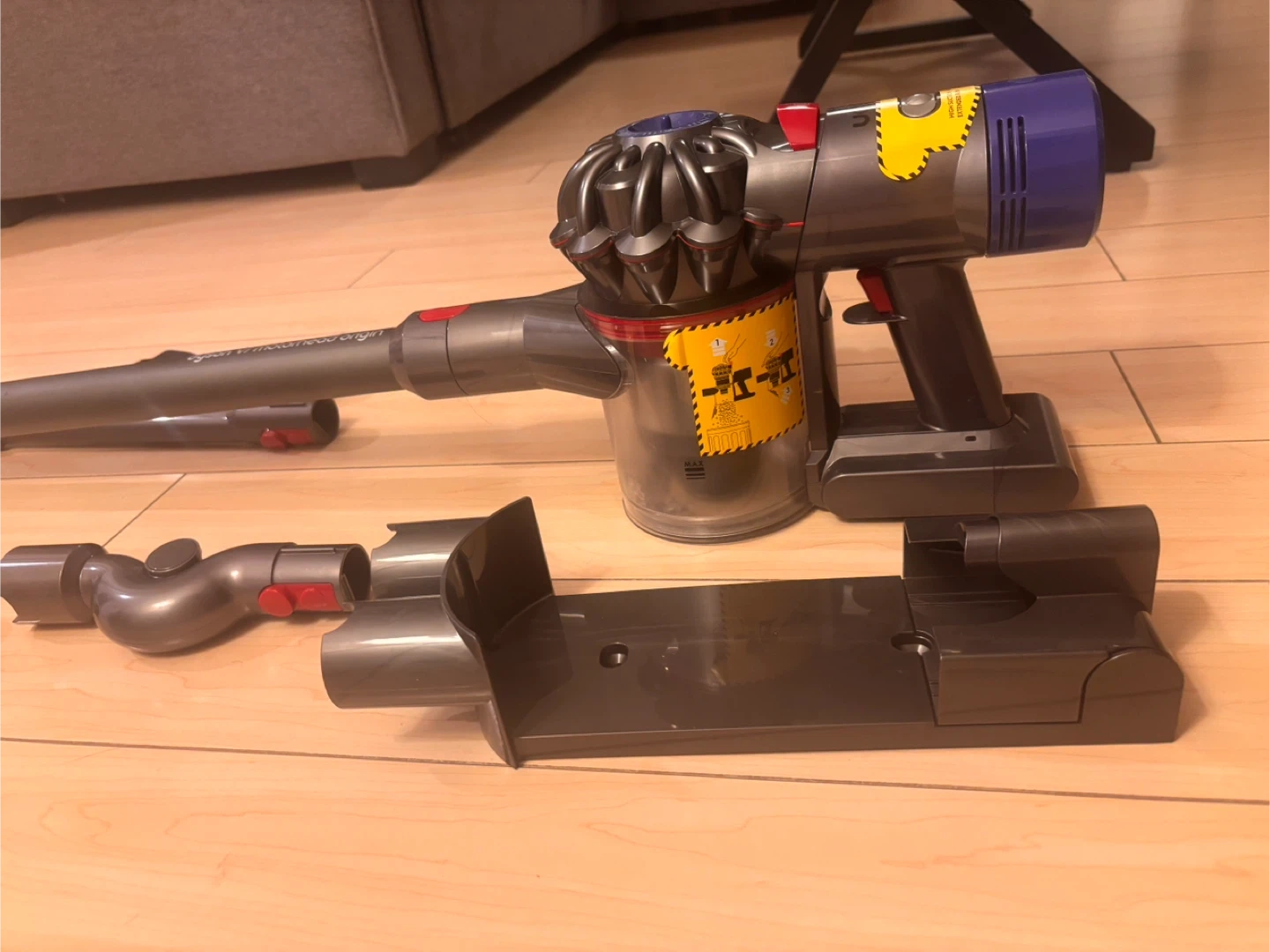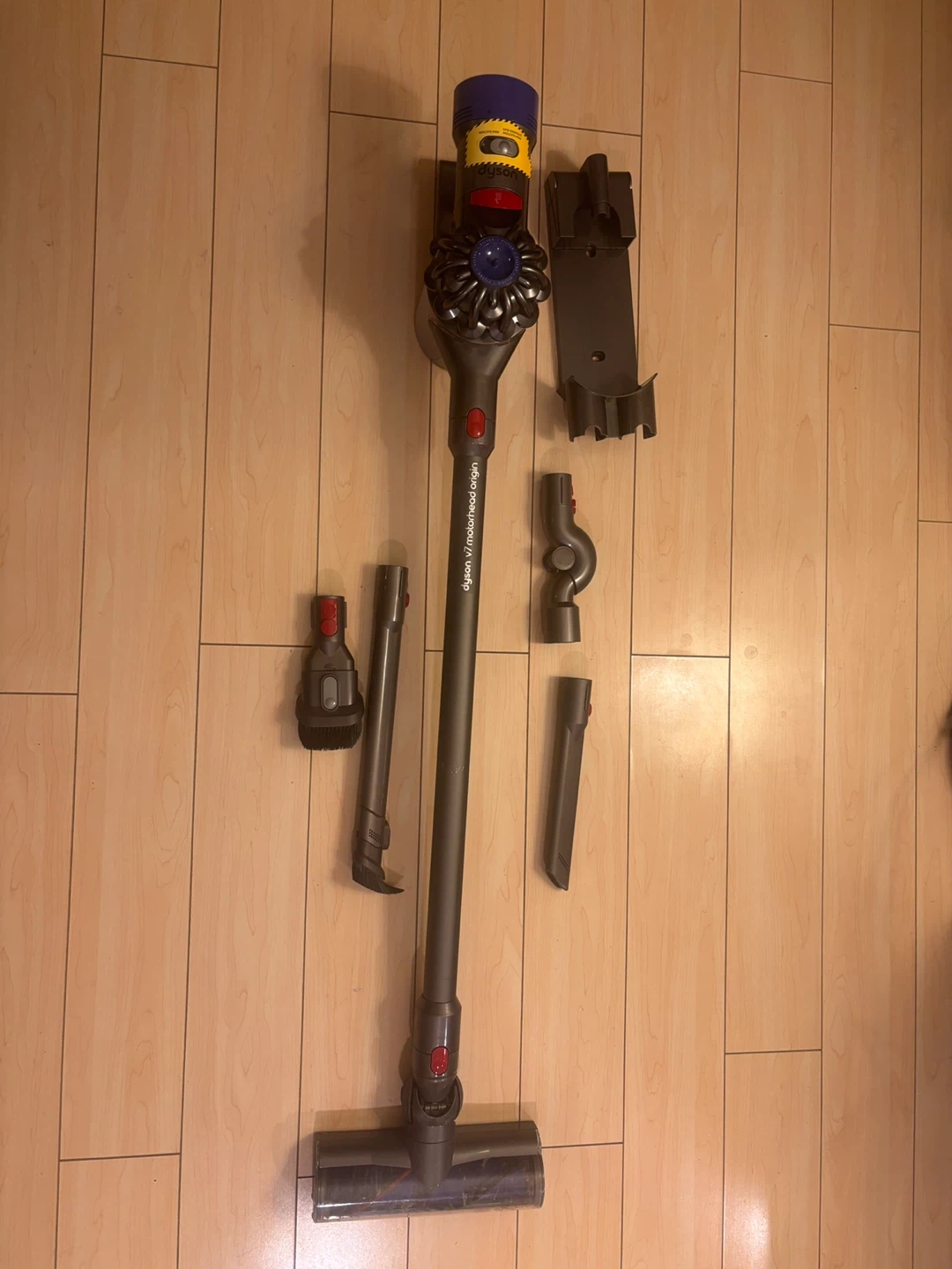 This is a Dyson cordless vacuum cleaner, grey and purple. It comes with several attachments and a charging dock. It's a powerful tool for cleaning your home!