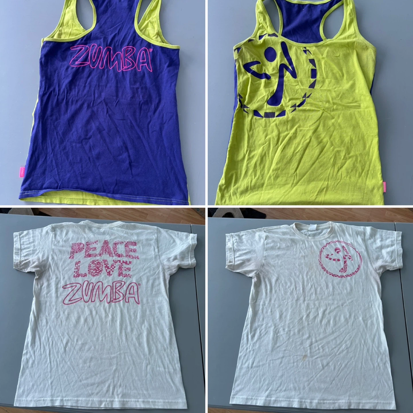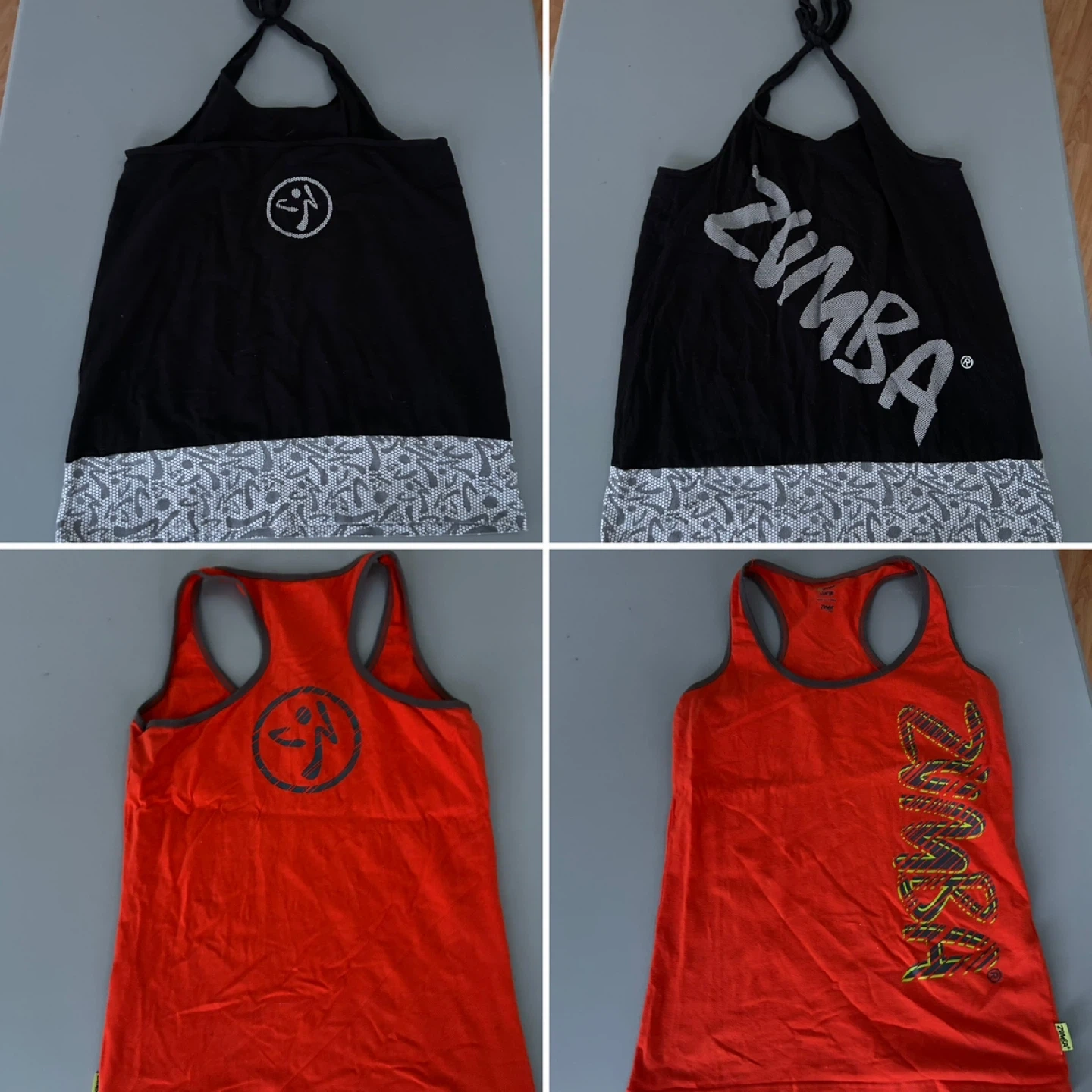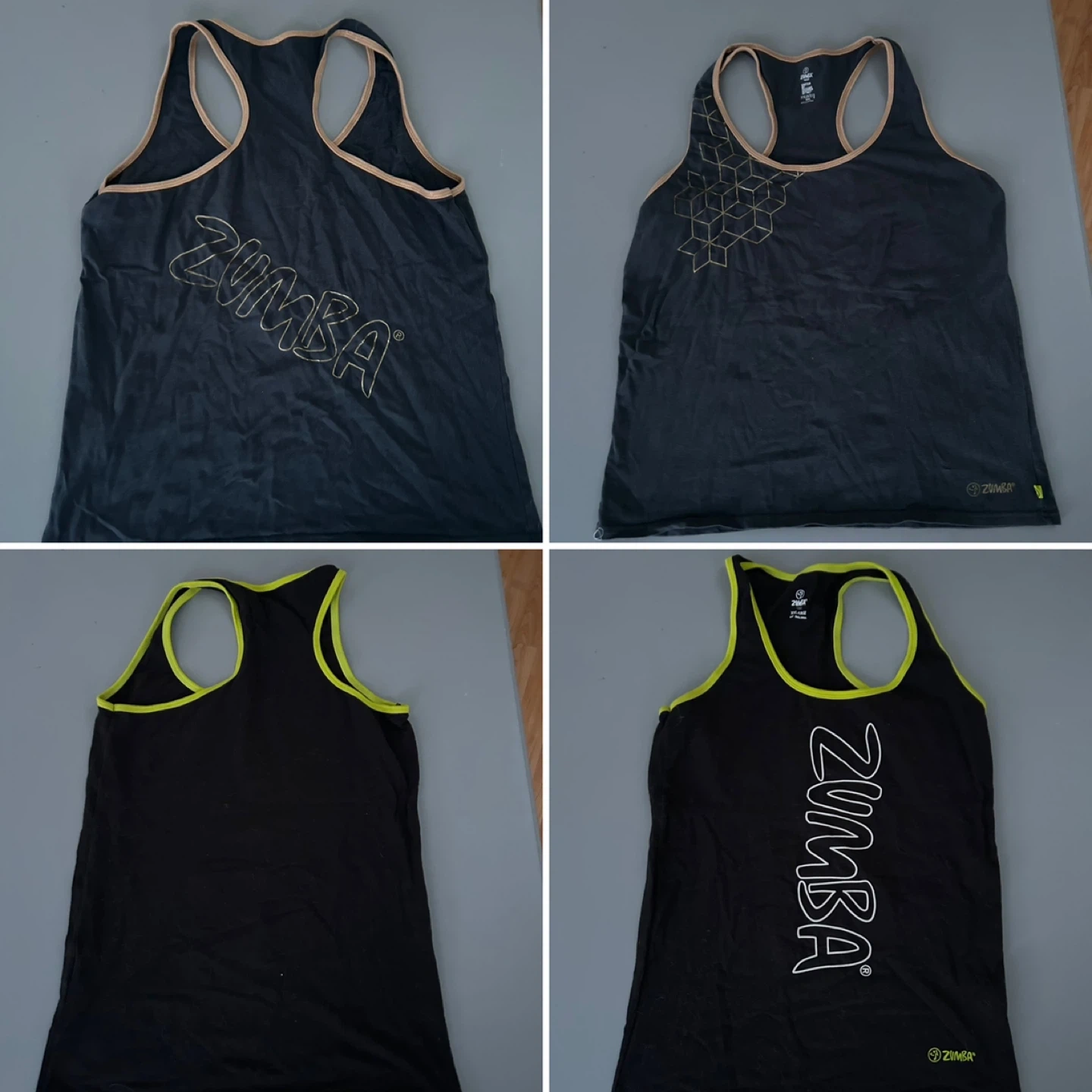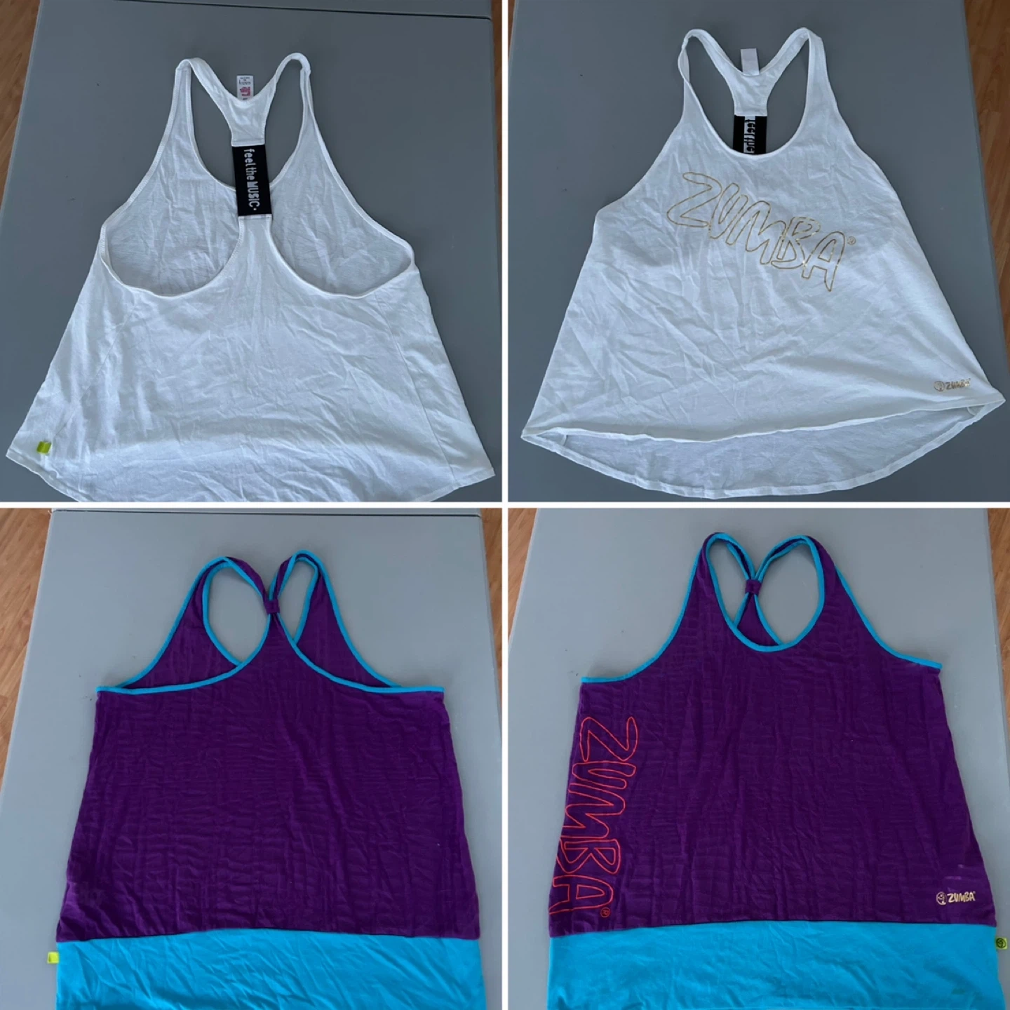 Bundle of various Zumba tank tops for your workouts. Includes multiple colours and styles, perfect for fitness enthusiasts. Made for active wear.