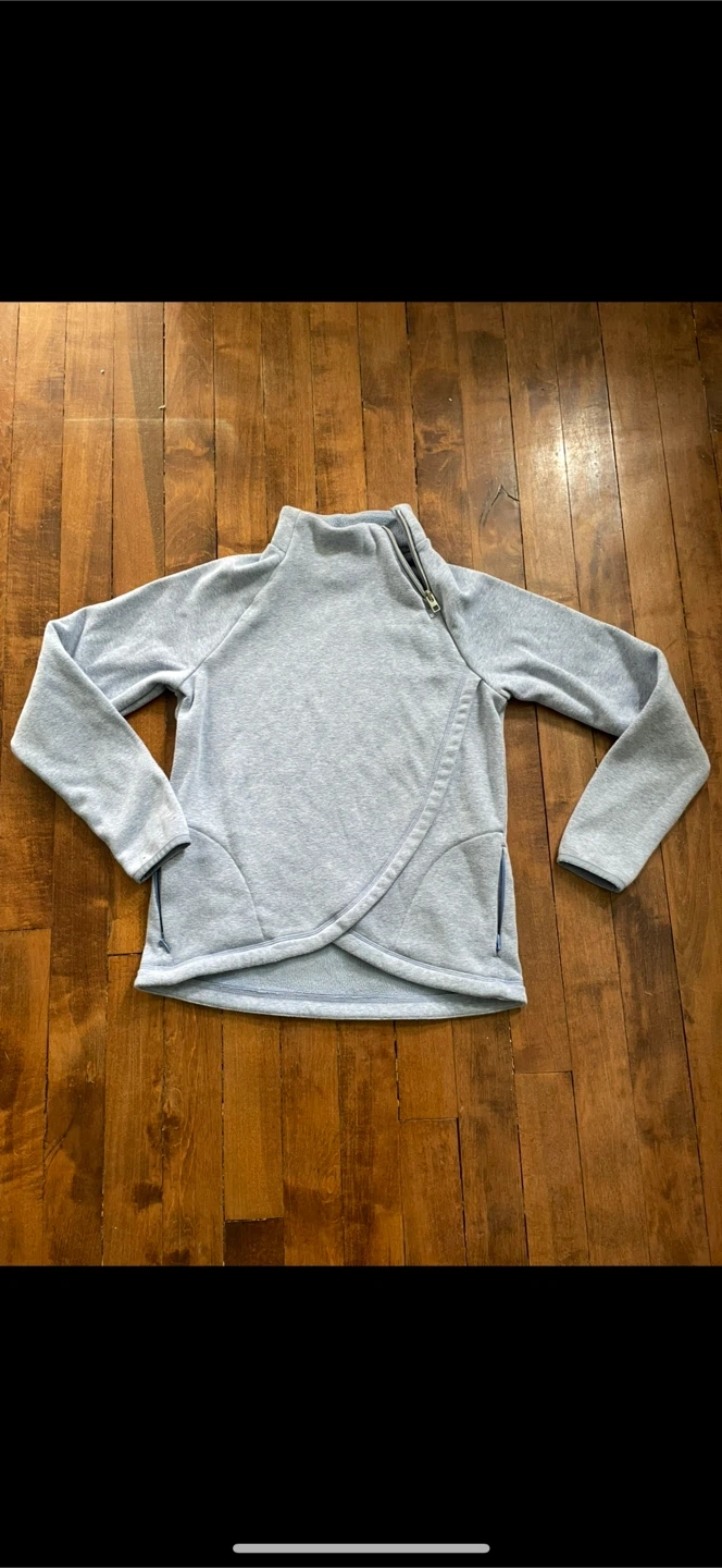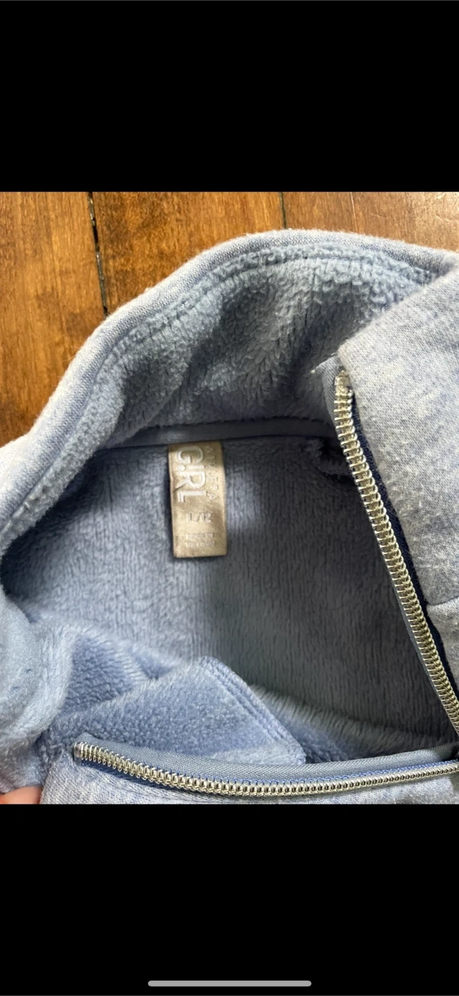 Cozy light purple fleece pullover for girls. It features a mock neck with a diagonal zipper closure and a crossover front hem. This soft sweatshirt has long sleeves and side pockets. It's made of polyester material.