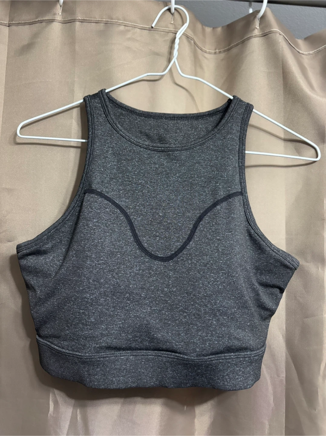 Comfortable grey sports bra for workouts. Made with 89% polyester and 11% spandex for a flexible fit. Size medium. It's designed for active wear. Fits XS to S. Carefully used few times. Doesn’t fit anymore.