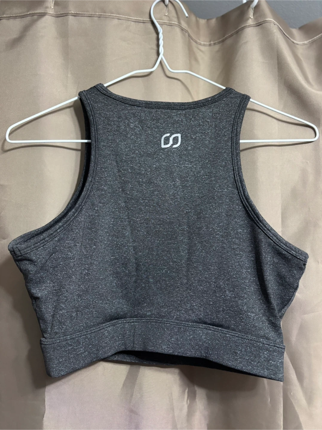 Comfortable grey sports bra for workouts. Made with 89% polyester and 11% spandex for a flexible fit. Size medium. It's designed for active wear. Fits XS to S. Carefully used few times. Doesn’t fit anymore.