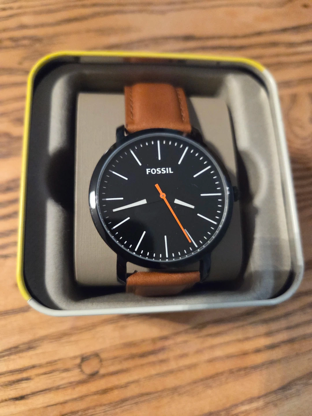 This is a Fossil watch with a black face and a brown leather strap. It comes in its original tin packaging. The watch has a classic design with clean hour markers and a pop of orange on the second hand.