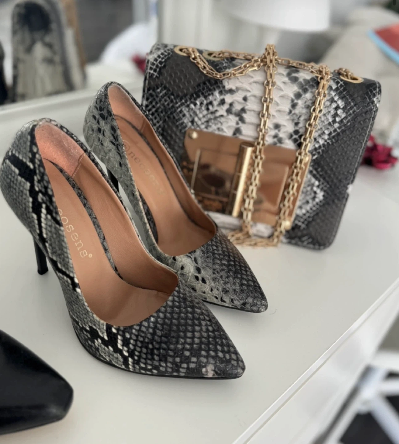 These stylish Neosens heels feature a grey and black snake print design with a matching clutch handbag. The heels have a pointed toe and gold-tone chain detail on the bag. It's a chic set for any occasion!