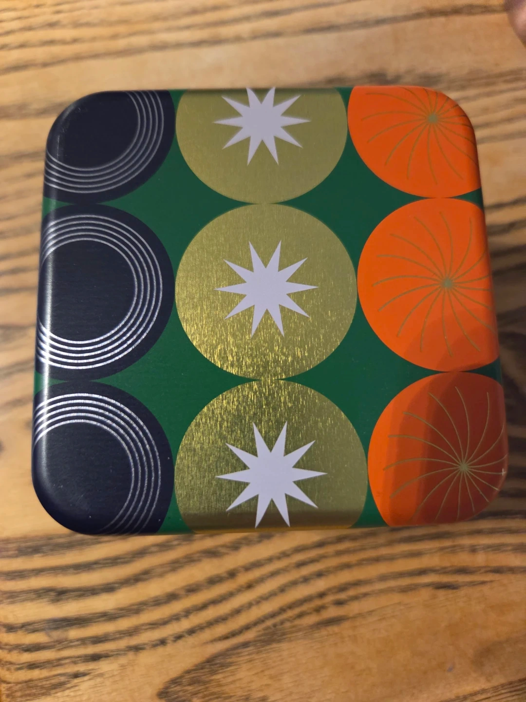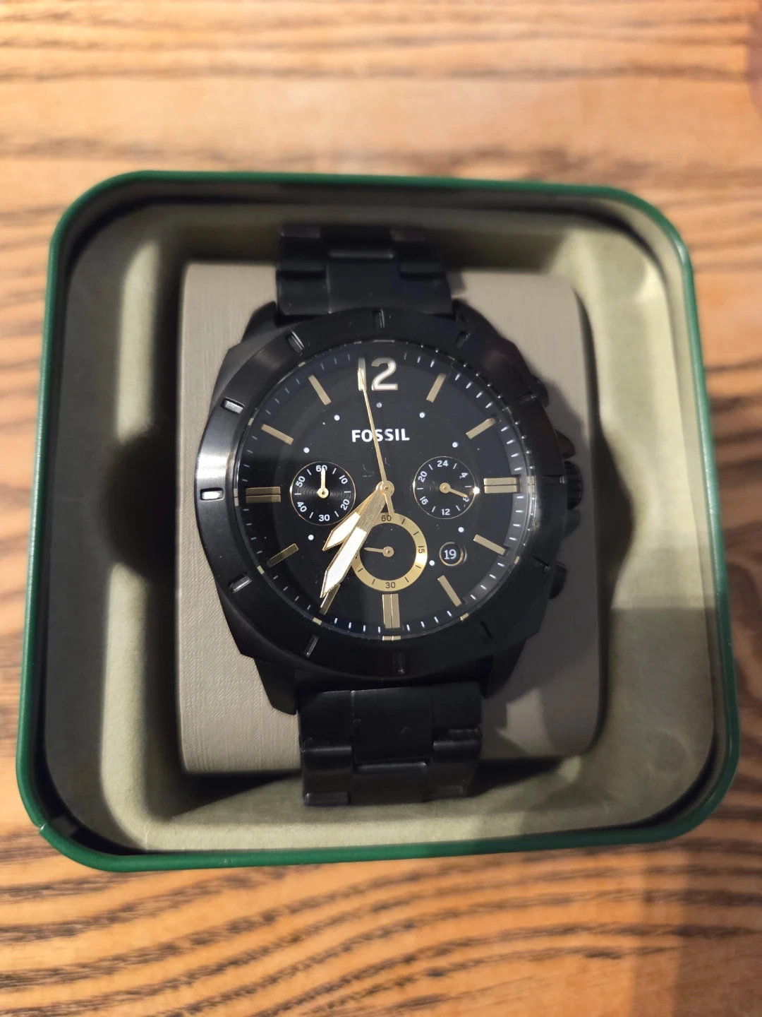This is a black Fossil chronograph watch with a gold dial. It comes in its original tin. The watch has a date display.