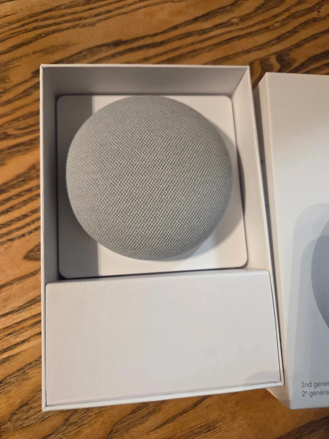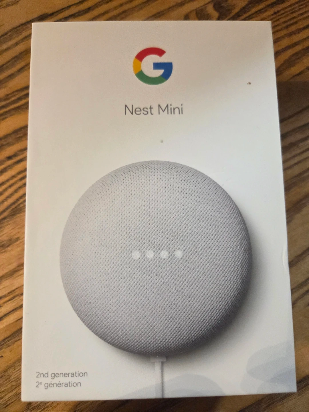 This is a Google Nest Mini, 2nd generation smart speaker in grey. It's in its original box. You can ask it questions, play music, and control your smart home devices.
