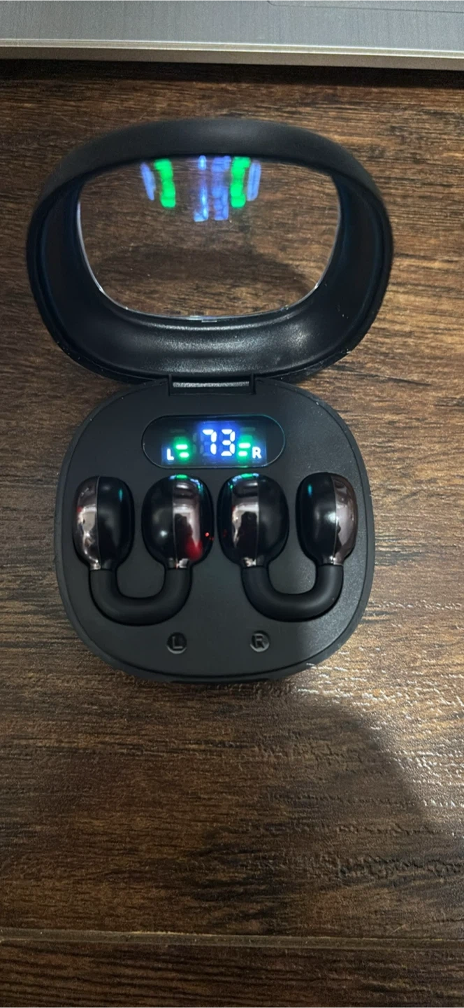 Wireless earbuds in black, complete with a charging case that shows battery level. It's in excellent condition and ready for a new owner!