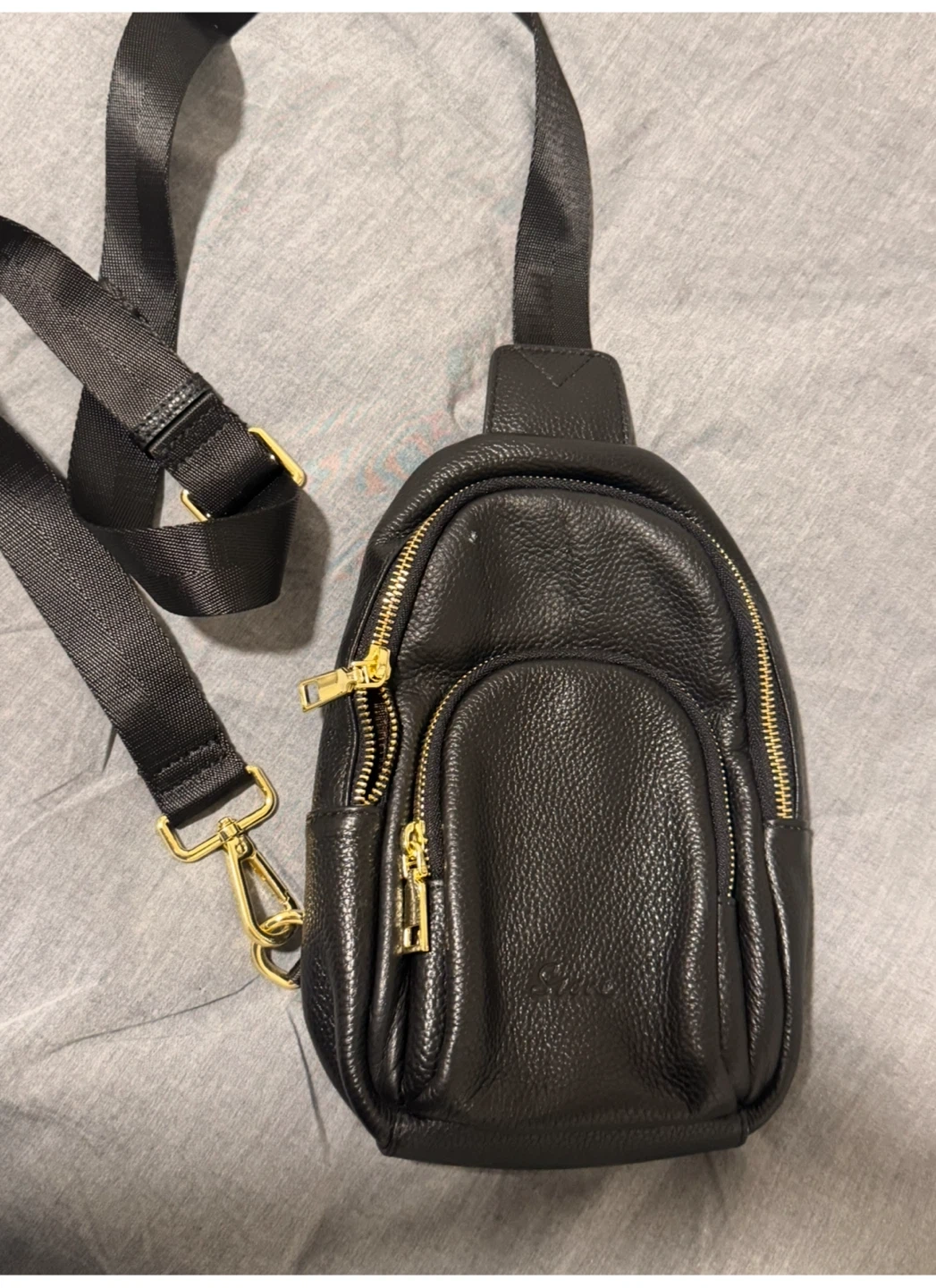 This black sling bag is made of textured leather with gold-tone zippers. It has multiple zippered compartments for organization. Adjustable strap for comfortable wear.