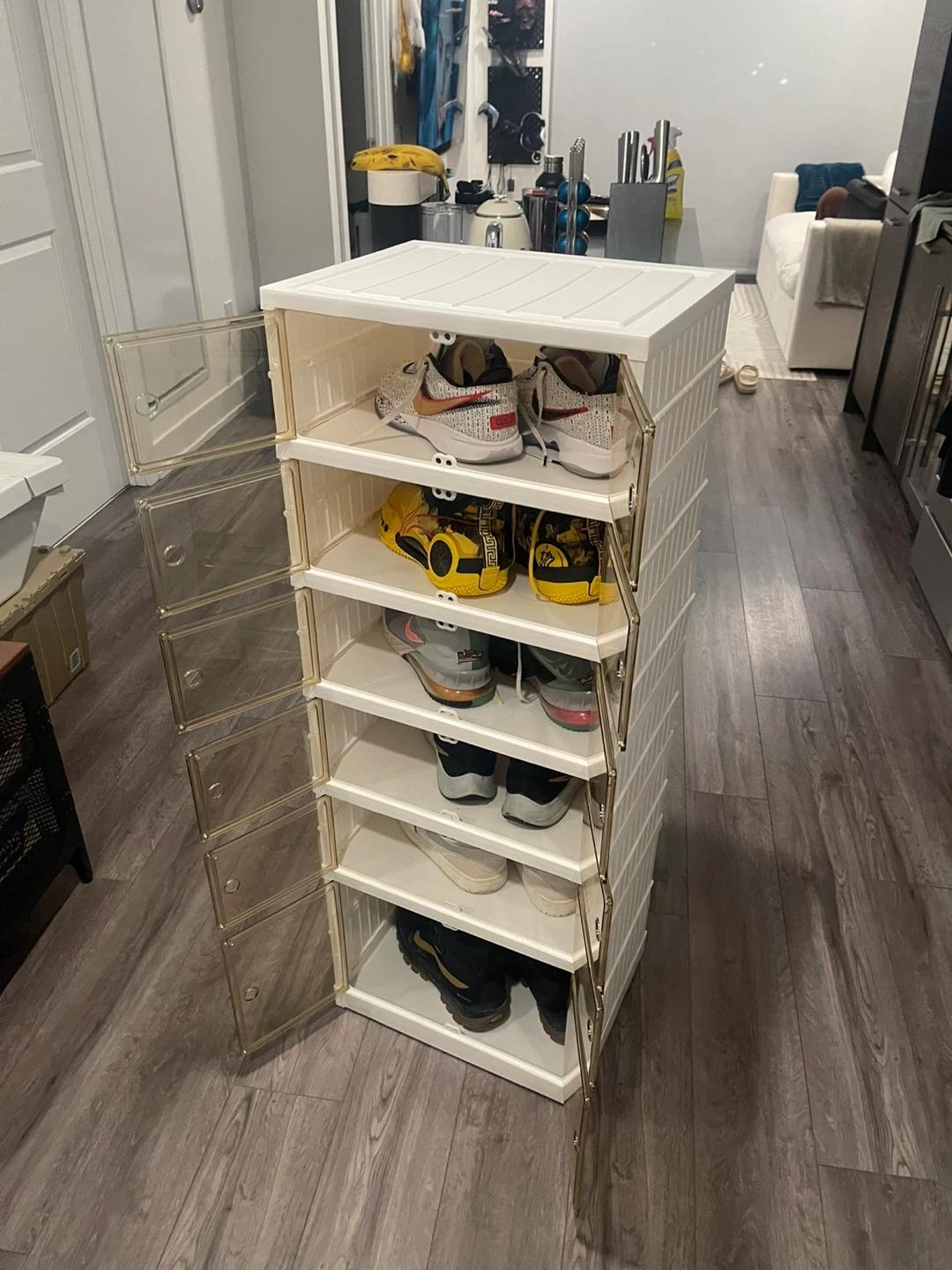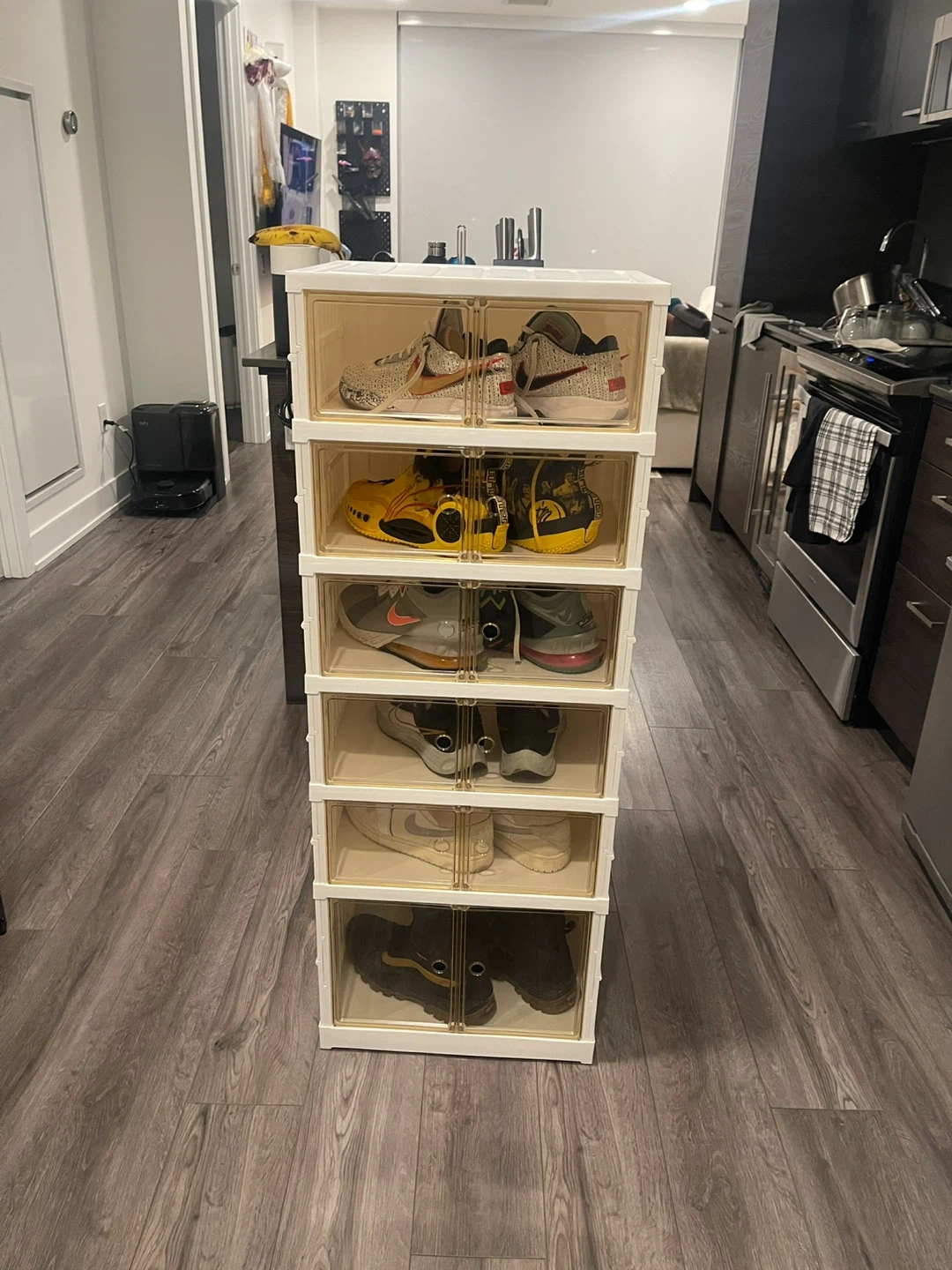 Keep your kicks tidy with this set of six stackable shoe storage boxes. Each box features a clear door for easy viewing of contents. Plastic construction.