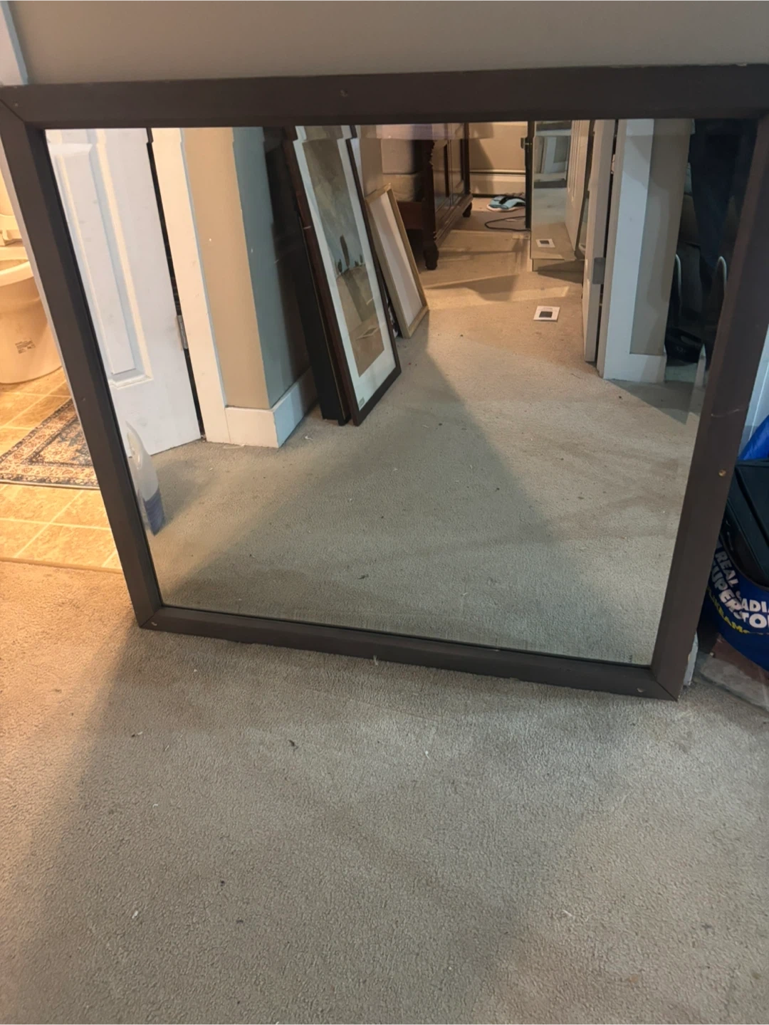 This is a rectangular wall mirror with a dark brown frame. Measures 40 x 37 Inches. It's a good size for a hallway or bedroom. It would brighten up any space!