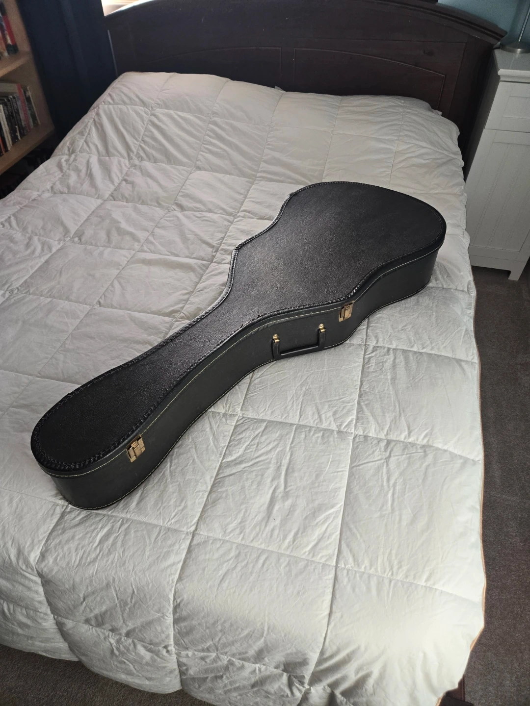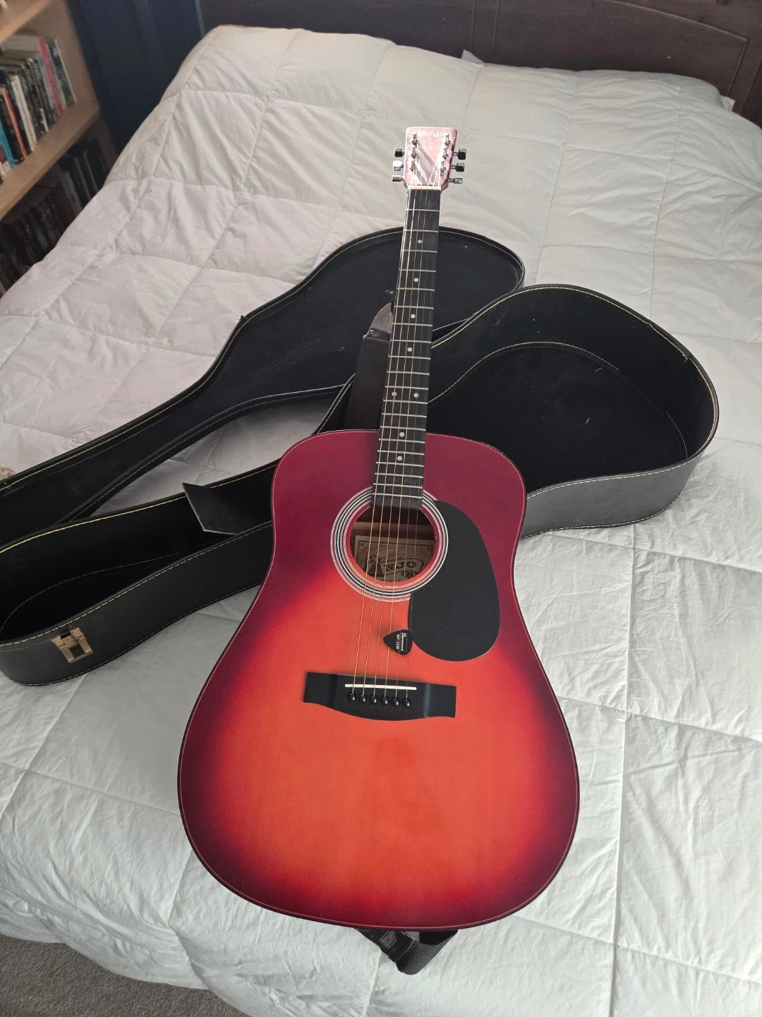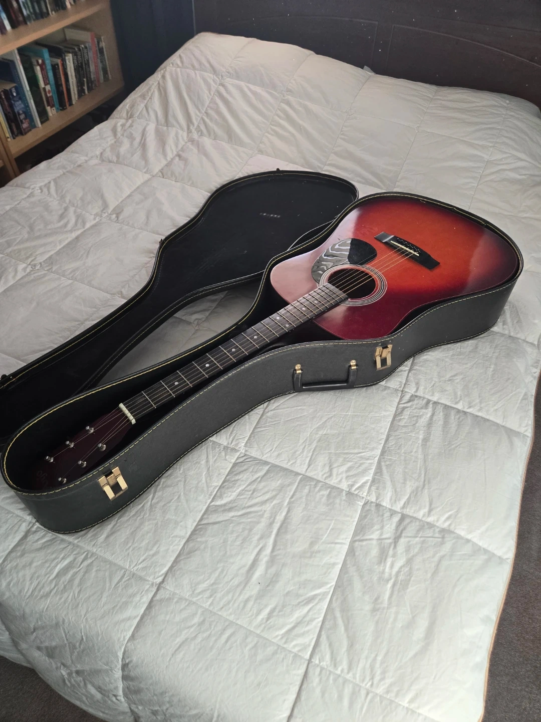 An acoustic guitar in beautifulshape. It comes with a hardshell case for protection and transport, along with 2 picks. This guitar is ready for its next jam session!