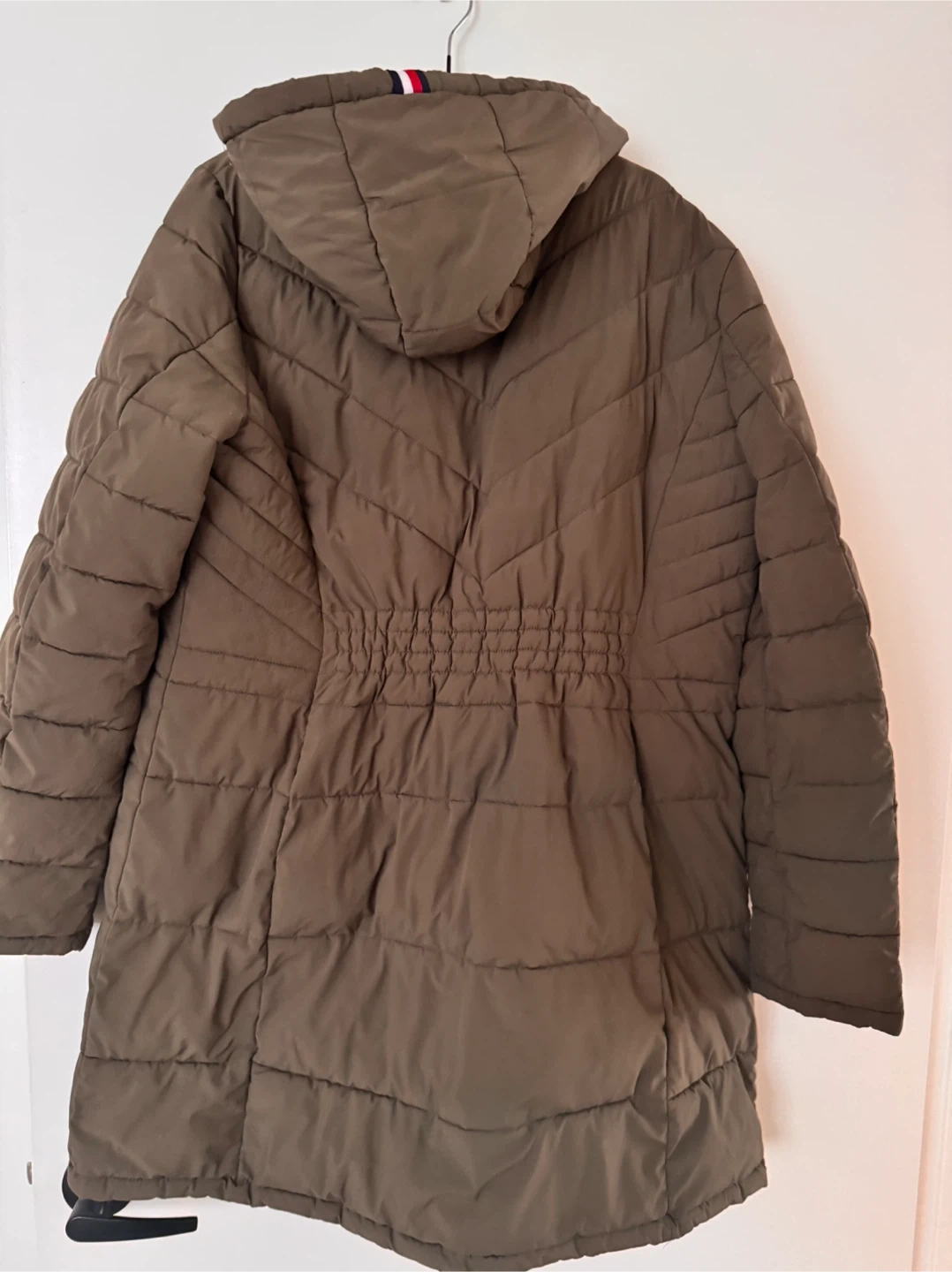 This is a brown puffer jacket from Tommy Hilfiger. It has a cinched waist and a hood. It's a warm coat for cooler weather!