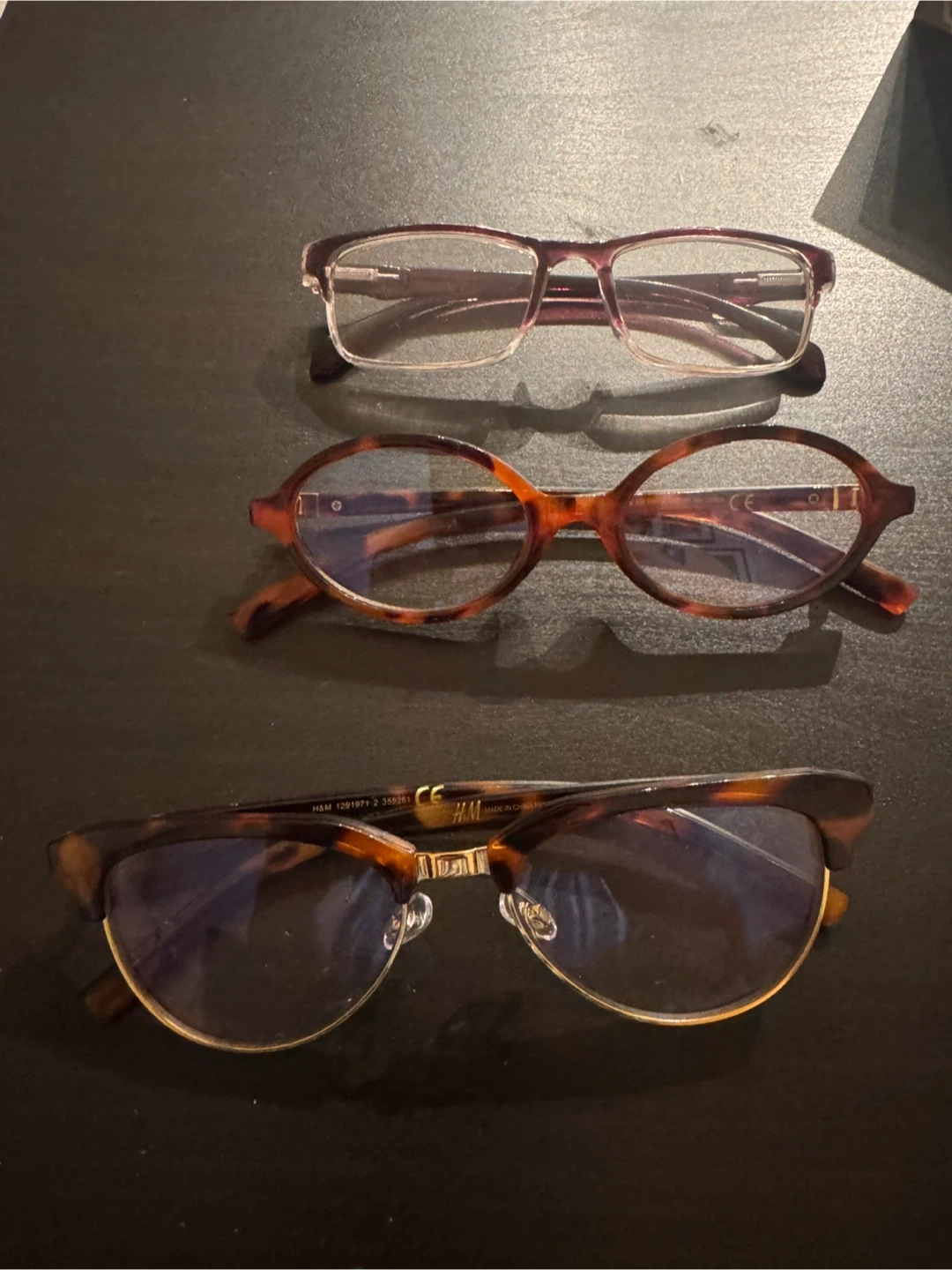 Three pairs of glasses. One pair is burgundy with clear lenses. Another pair is tortoiseshell with clear lenses. The third pair is tortoiseshell and gold-tone with blue-tinted lenses. Made in China.