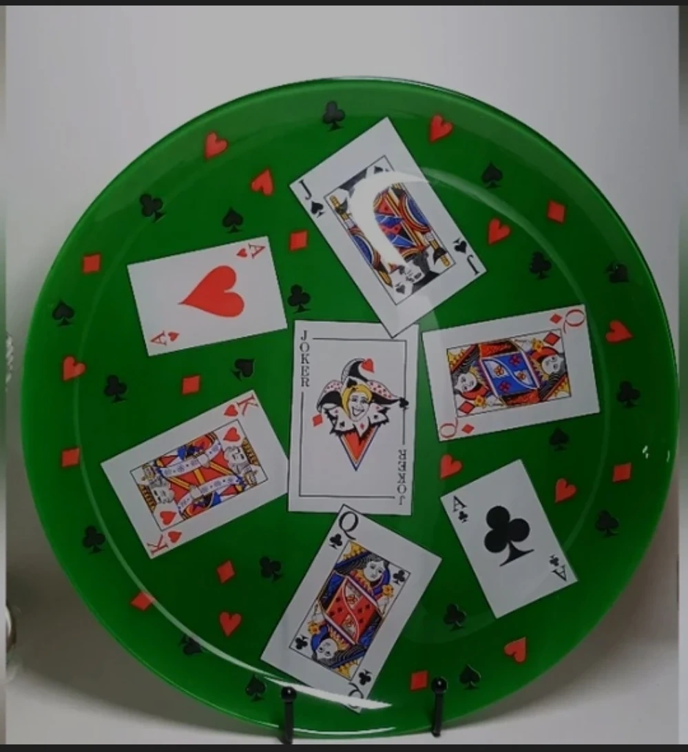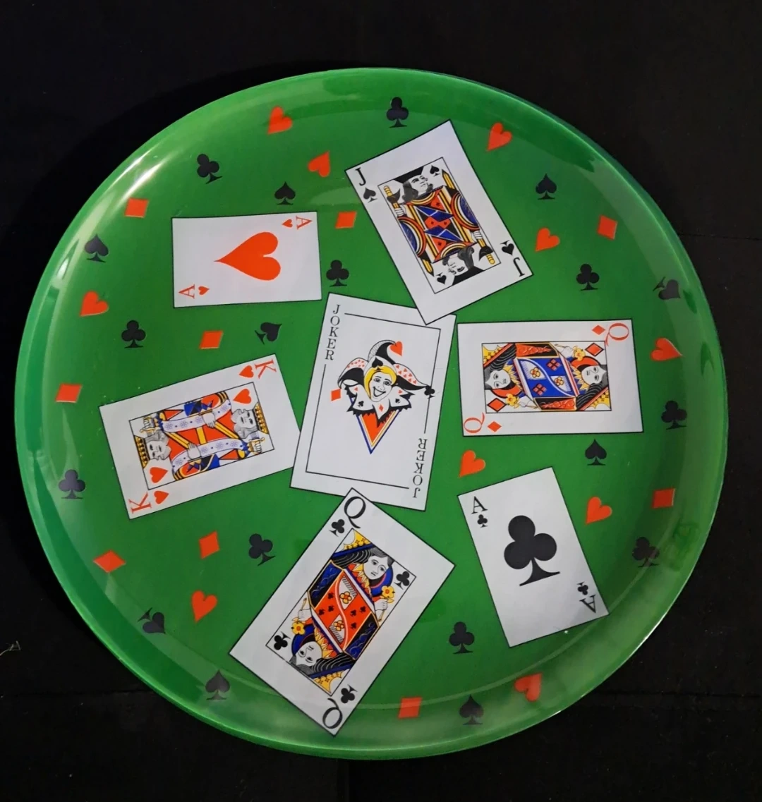 This vintage originally made in france round serving tray features a green background with a repeating pattern of playing card suits. It has various playing cards, including Jokers, Kings, Queens, and Aces, printed on its surface. This tray's design makes it a fun addition to game nights or for serving snacks.