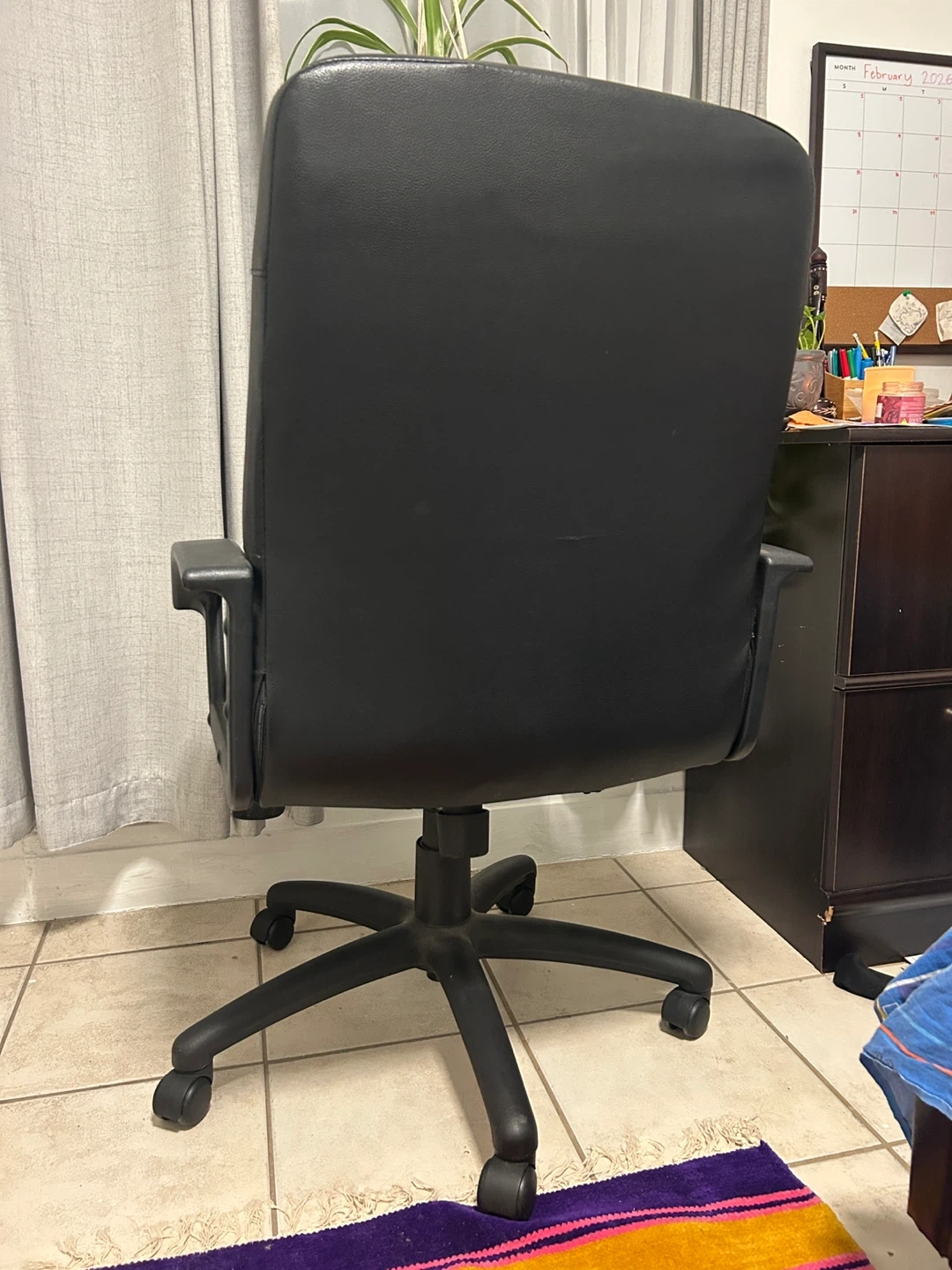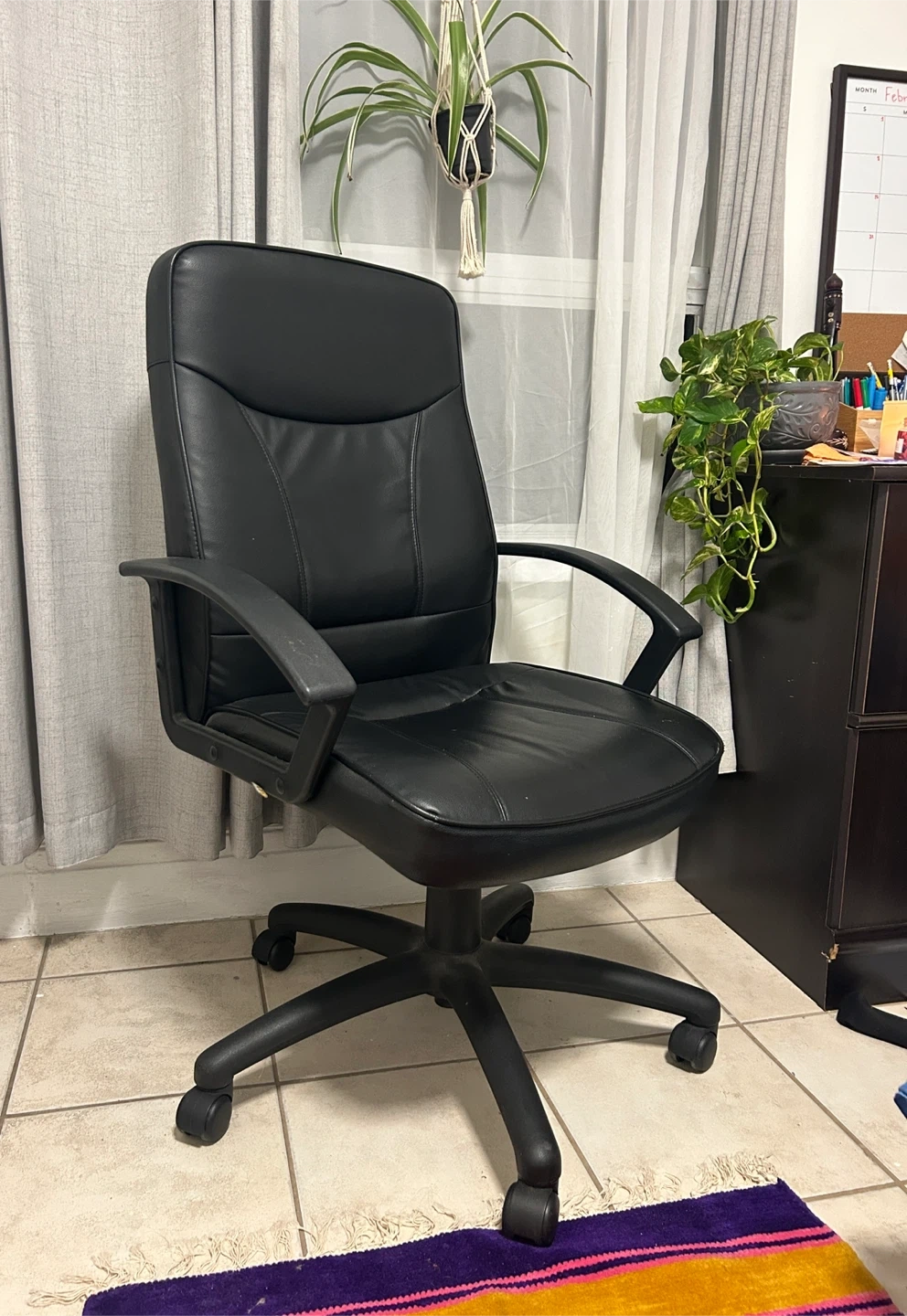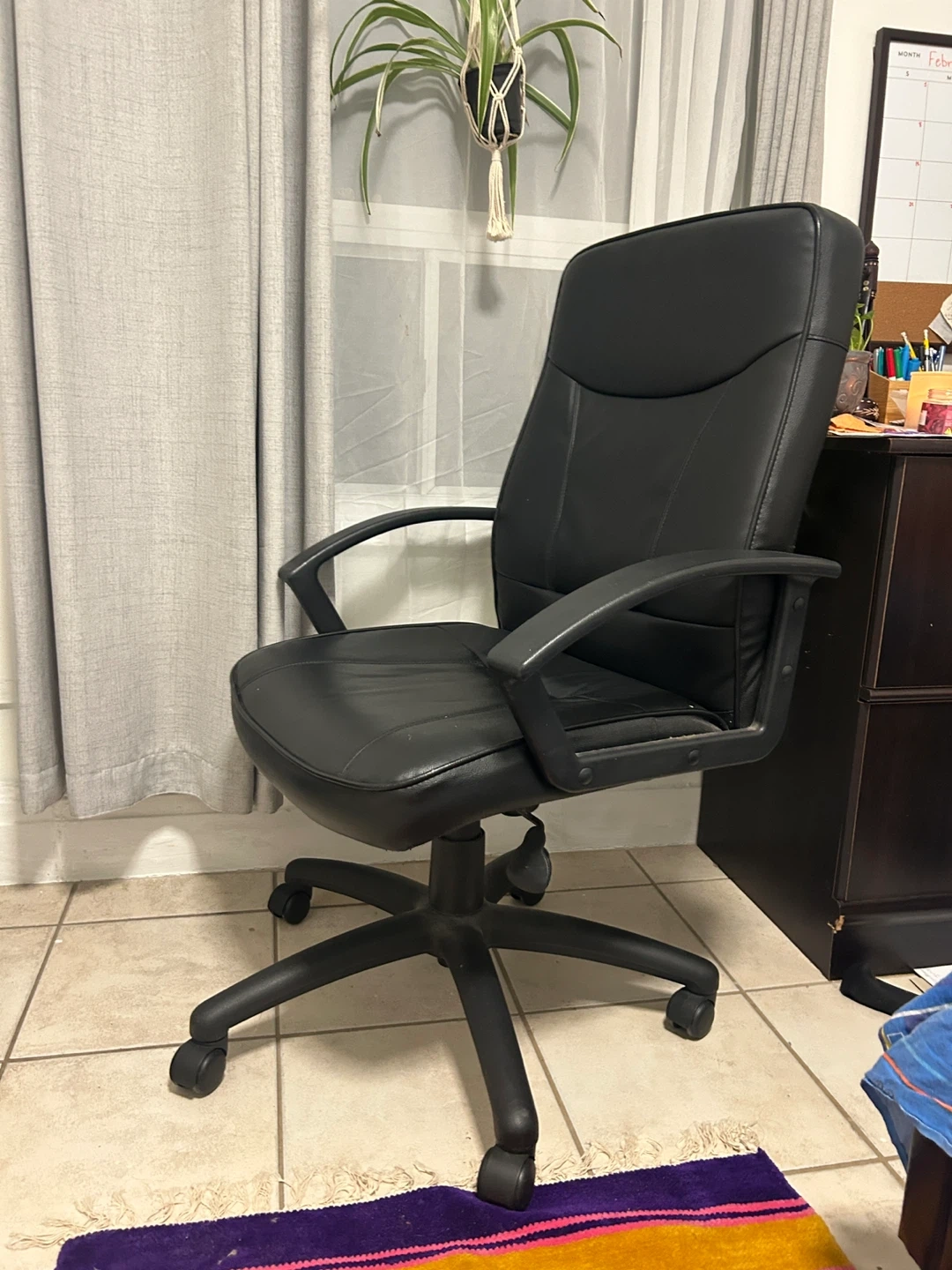 This is a black faux leather office chair. It's a standard desk chair with rolling casters for mobility. The seat and back are padded for comfort. It has been used for the last 3 years. Height is also adjustable!