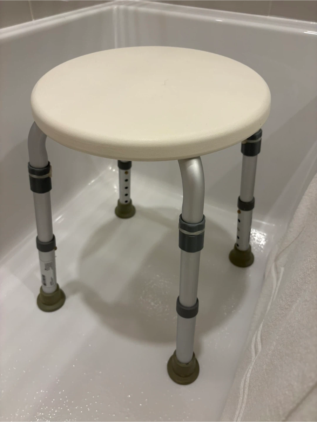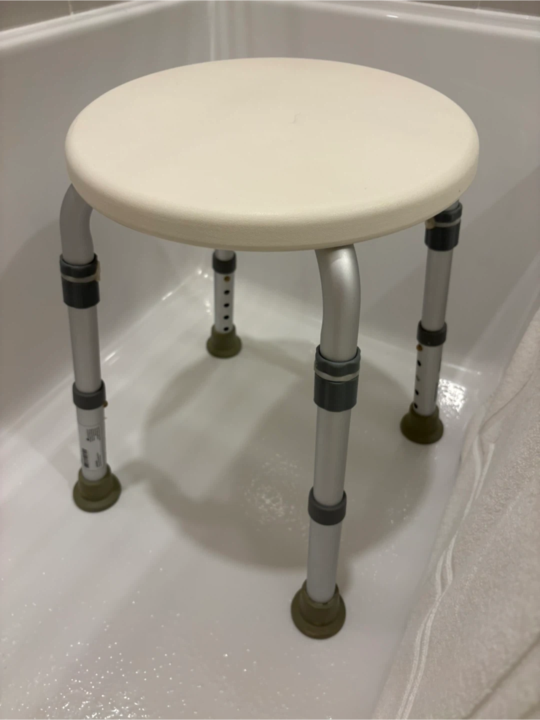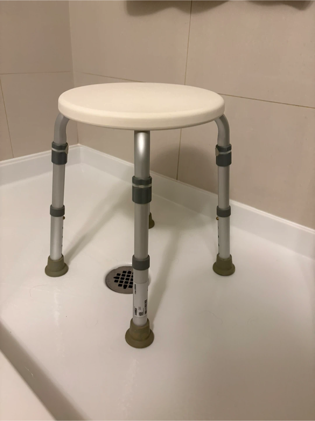 This is an adjustable shower stool. It's made with aluminium legs and a plastic seat. The legs are height adjustable for a custom fit. It's useful for providing stability in the shower or tub. Max height 17.5 inches lowest height 13 inches