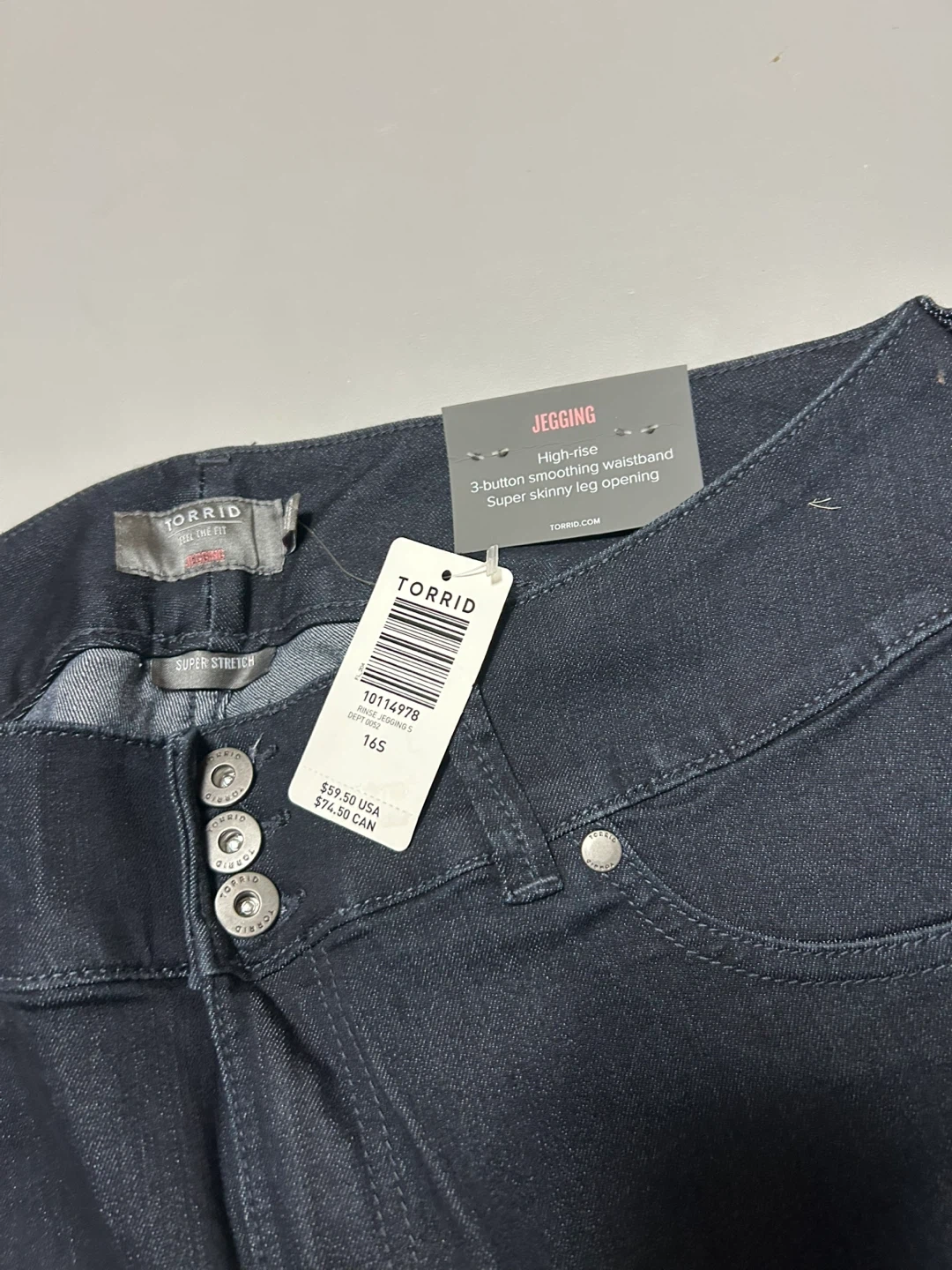Brand New with tags. These Torrid jeggings come in a dark wash denim. They feature a high-rise, 3-button smoothing waistband, and a super skinny leg opening. The fabric is super stretch for comfort. These are great for everyday wear!