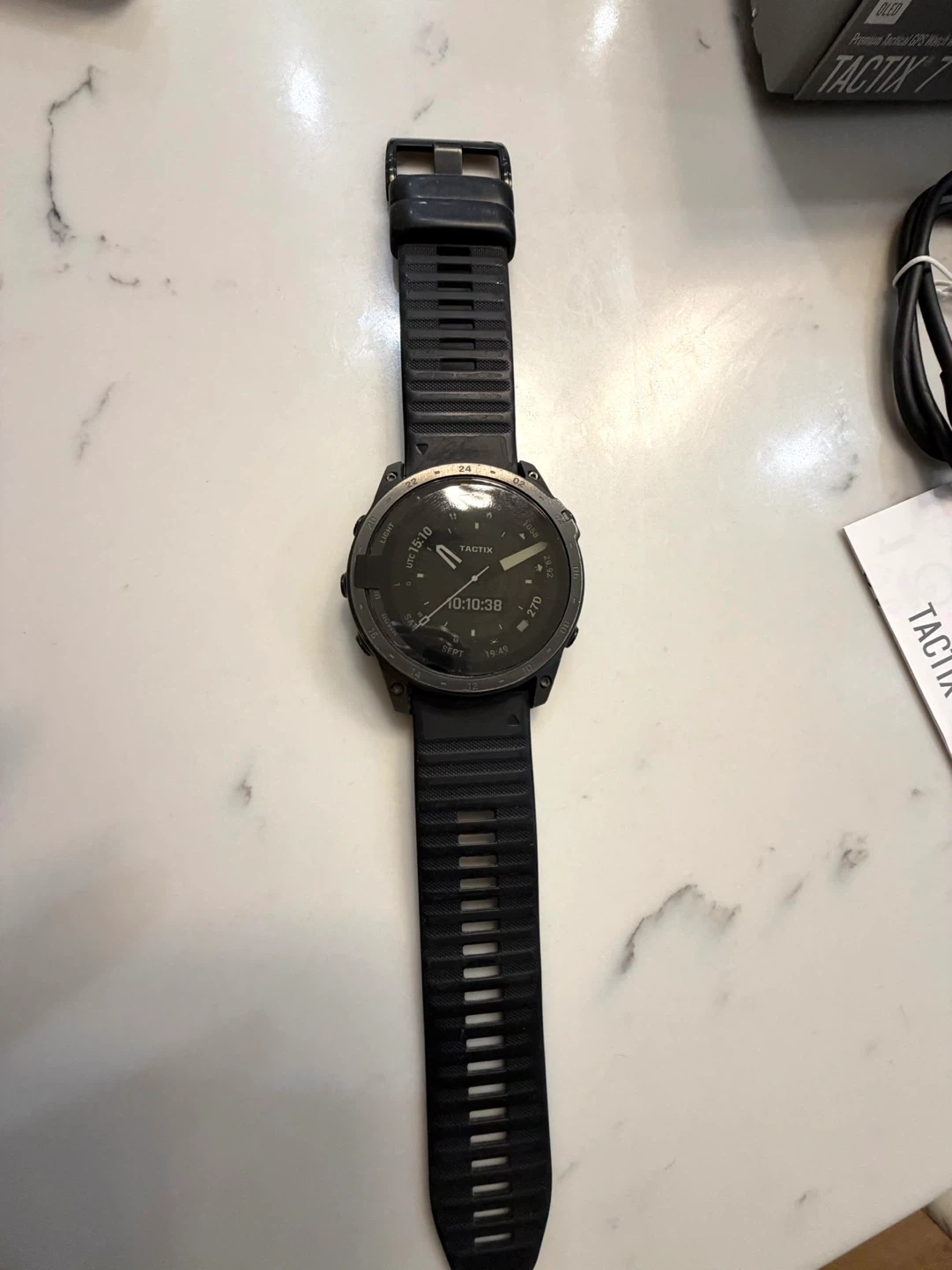 Garmin Tactix 7 OLED smartwatch. Includes original box, charging cable, and extra band. This tactical GPS watch is built tough for any adventure. It's packed with smart features for daily use and rugged performance. Built for adventurers and athletes!