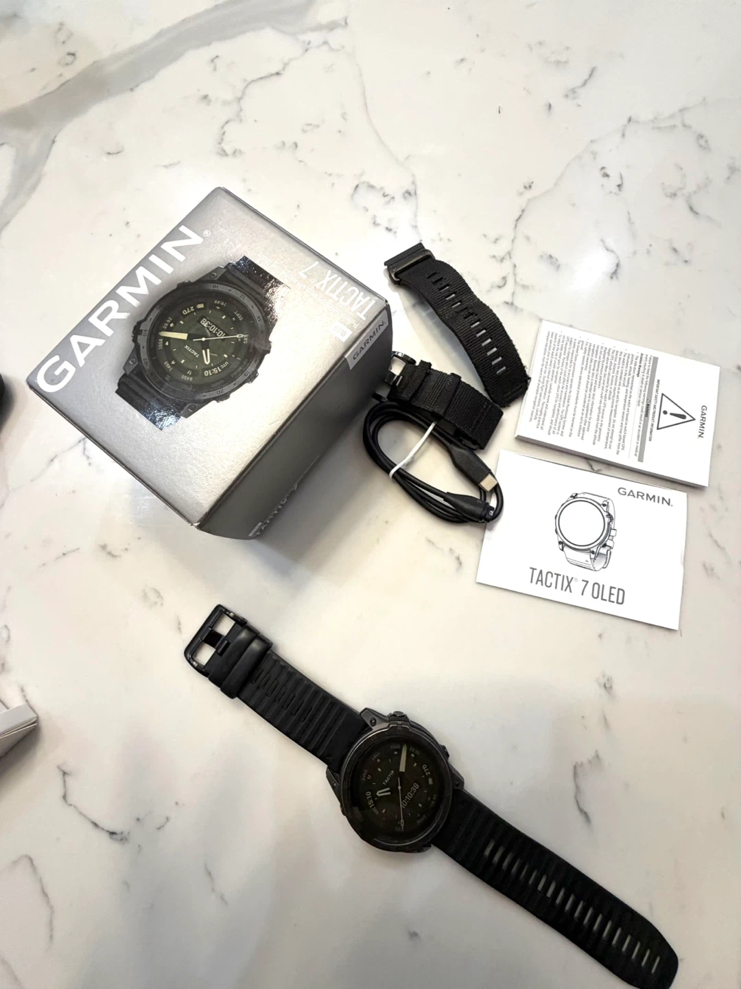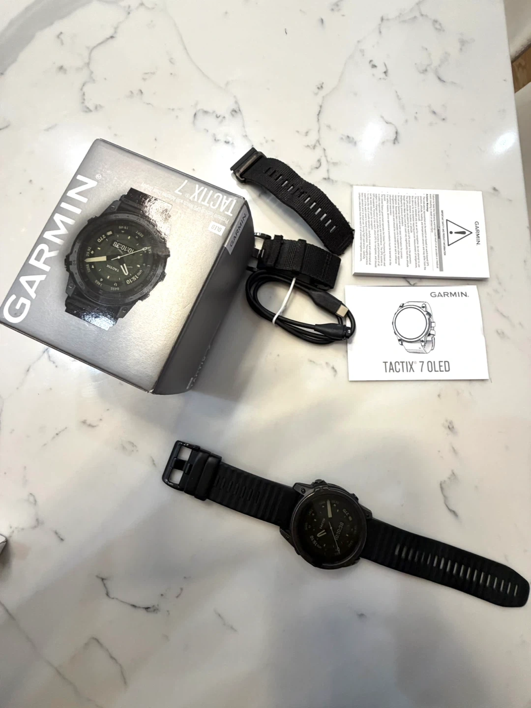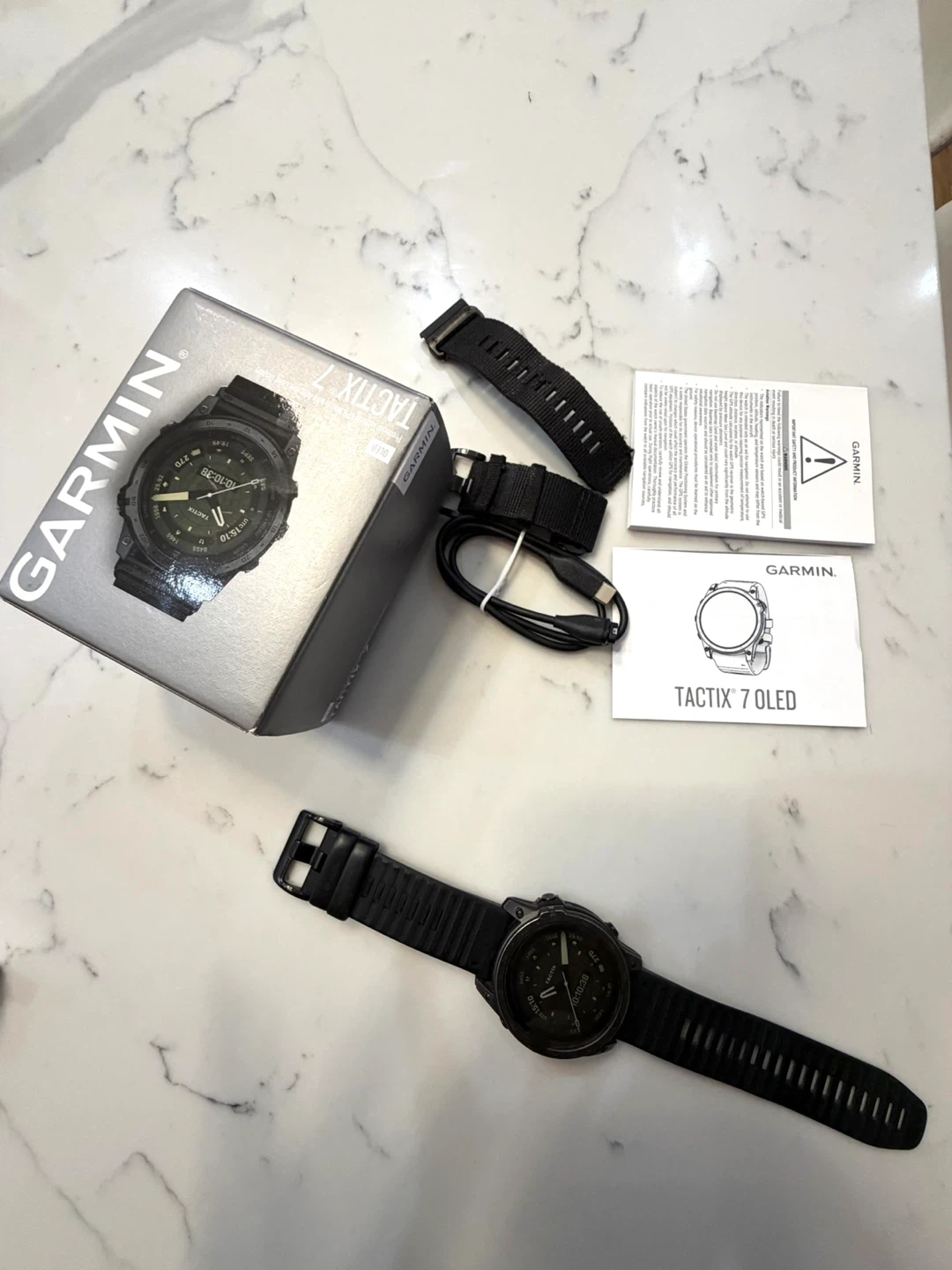 Garmin Tactix 7 OLED smartwatch. Includes original box, charging cable, and extra band. This tactical GPS watch is built tough for any adventure. It's packed with smart features for daily use and rugged performance. Built for adventurers and athletes!