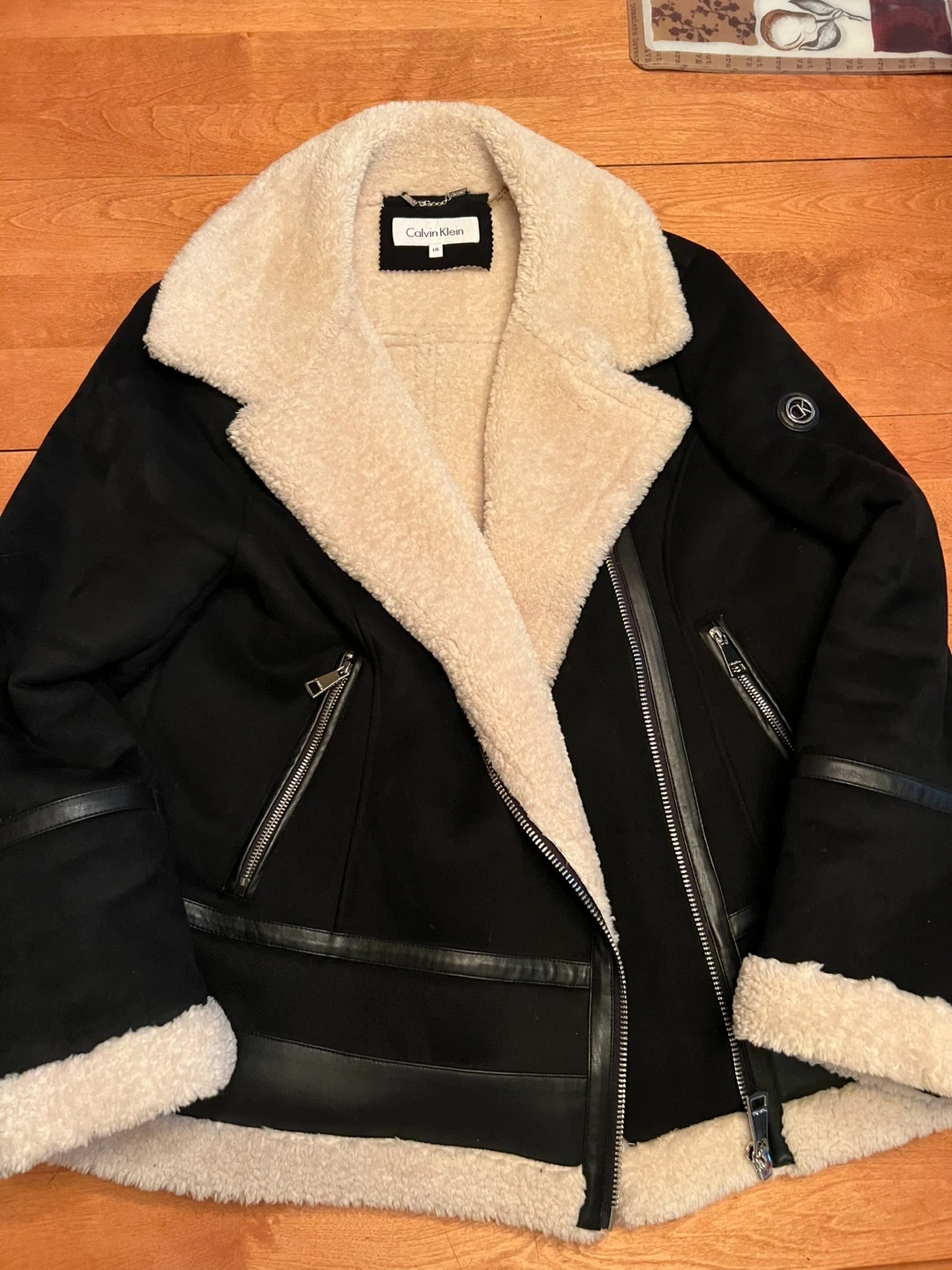 Calvin Klein jacket with a black suede-like exterior and cozy sherpa lining.