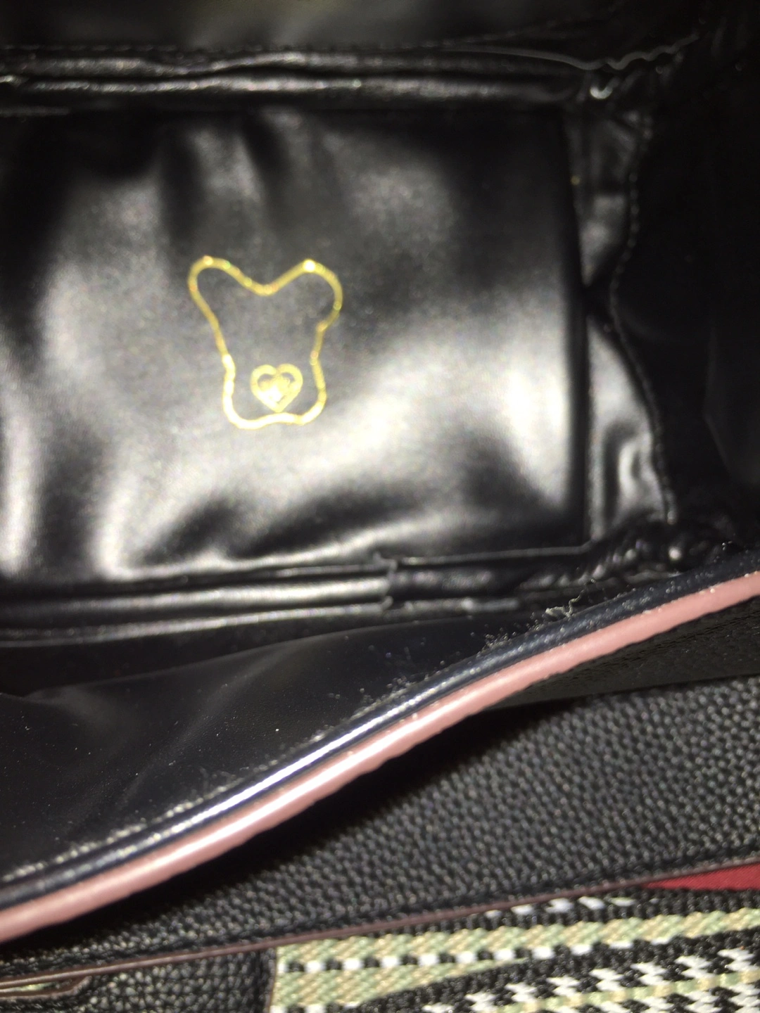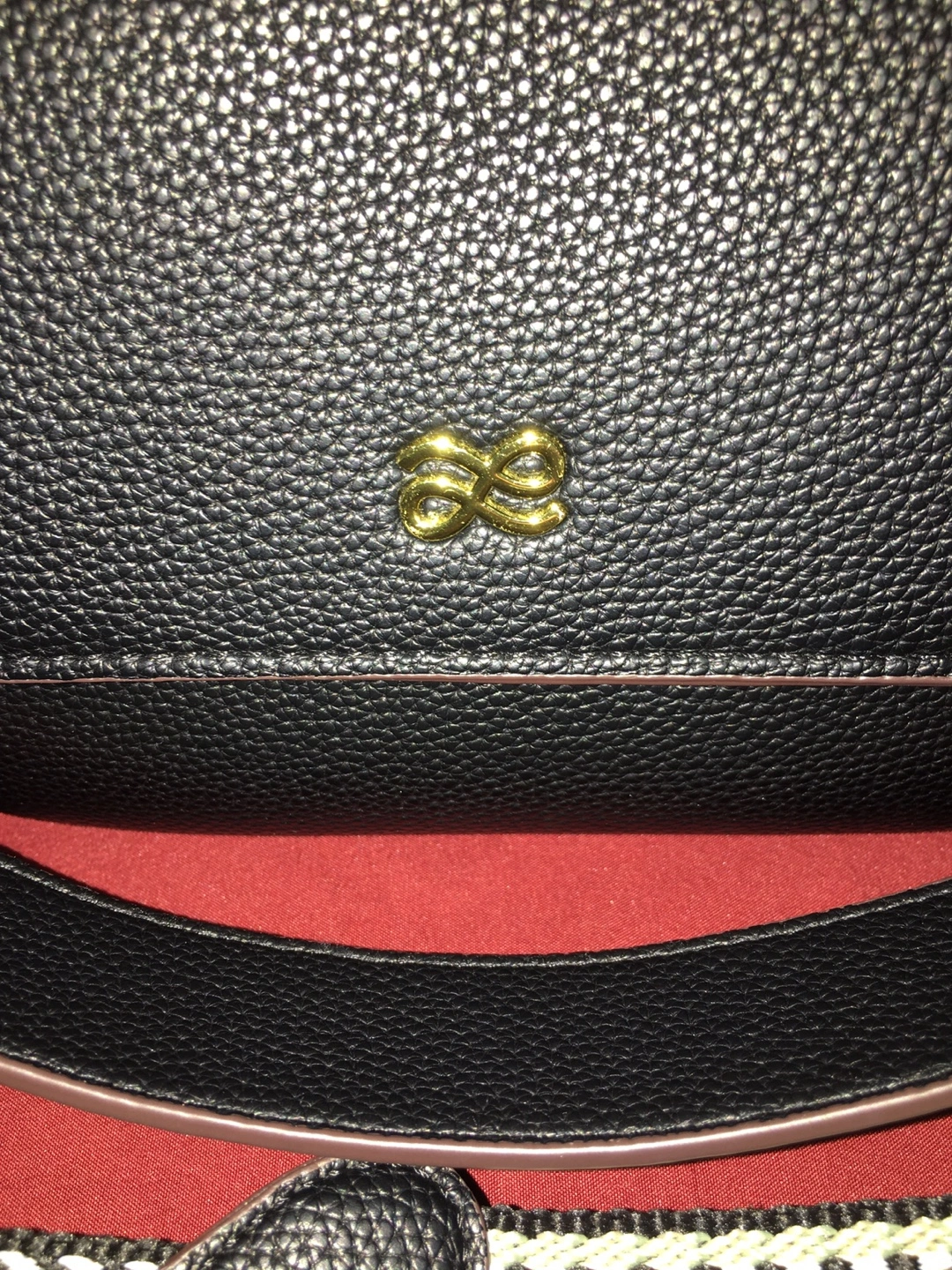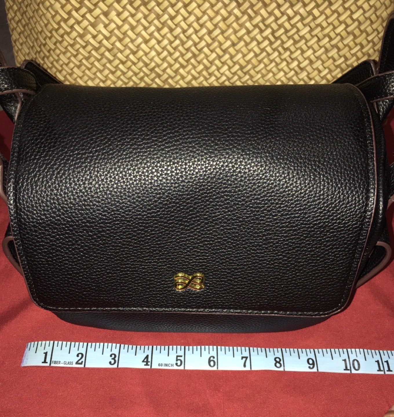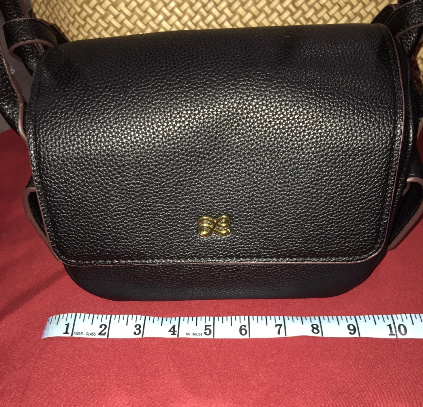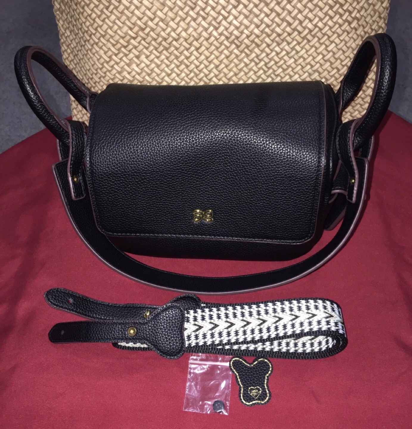 Stylish black faux leather crossbody bag. It's got a pebble-grain texture and a gold-tone logo accent. Comes with a decorative patterned strap and an additional plain black strap.