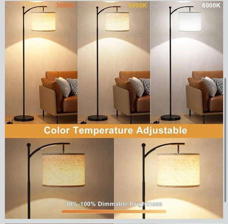 Modern floor lamp for living room with a beige shade and black pole. Features remote control for stepless dimming and adjustable color temperature and brightness.