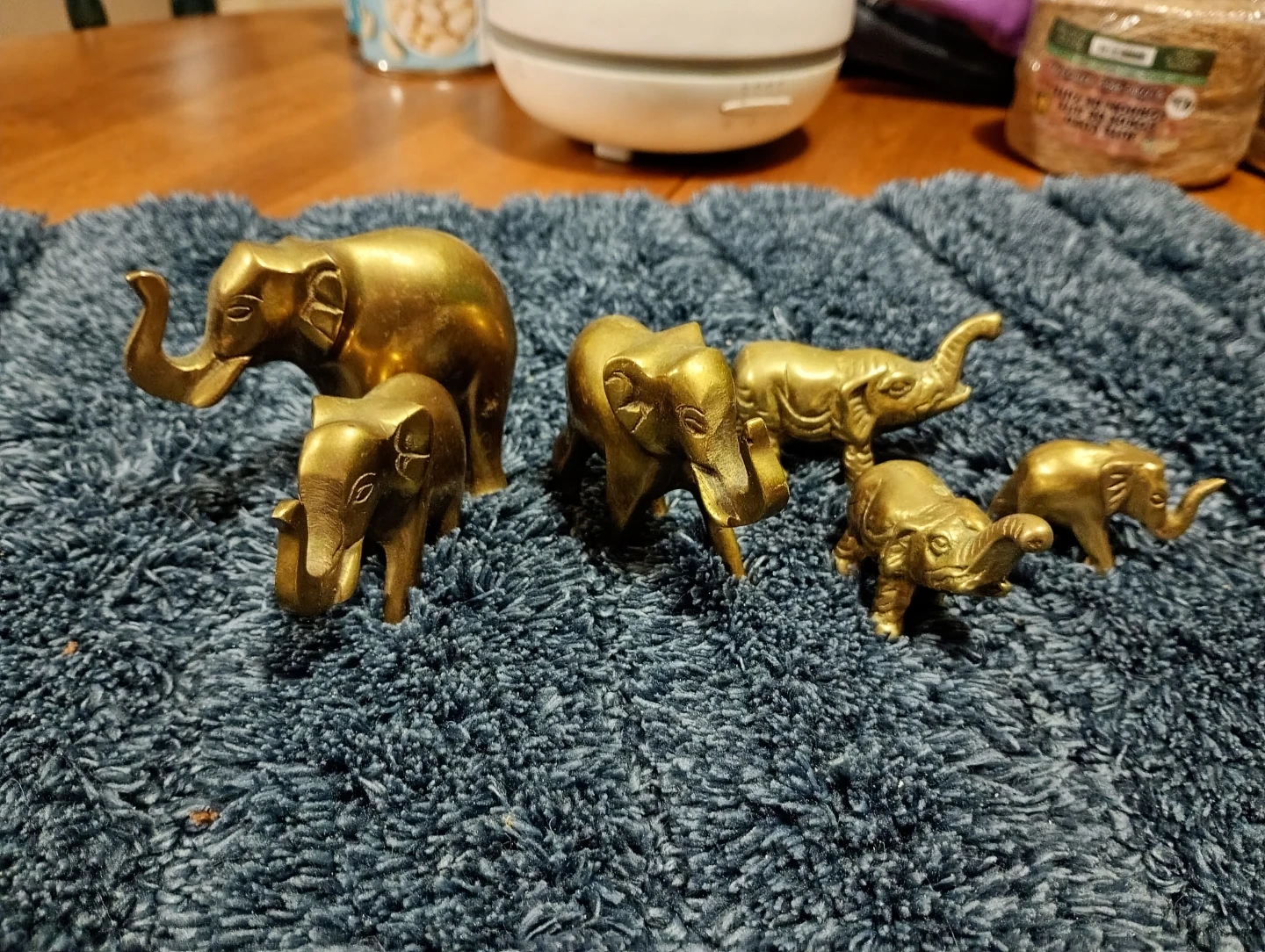 A charming collection of six brass elephant figurines. These decorative pieces are crafted from brass and vary in size. They're perfect for adding a touch of vintage charm to any shelf or tabletop. These would make a lovely gift for an elephant enthusiast!