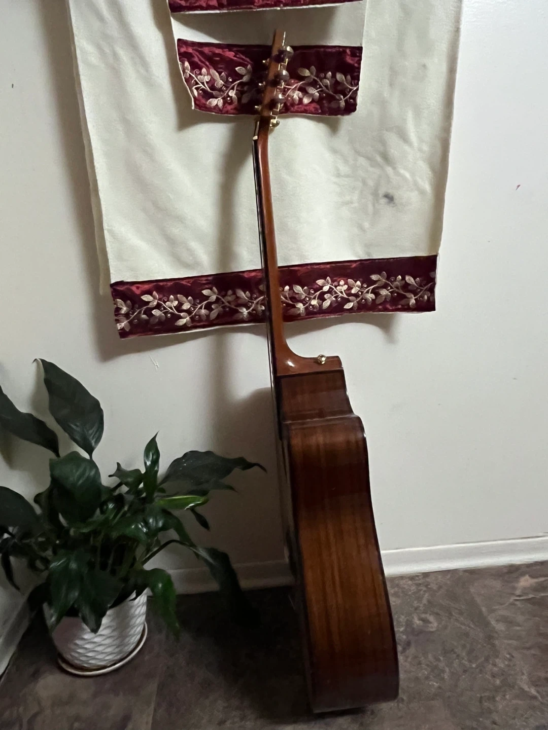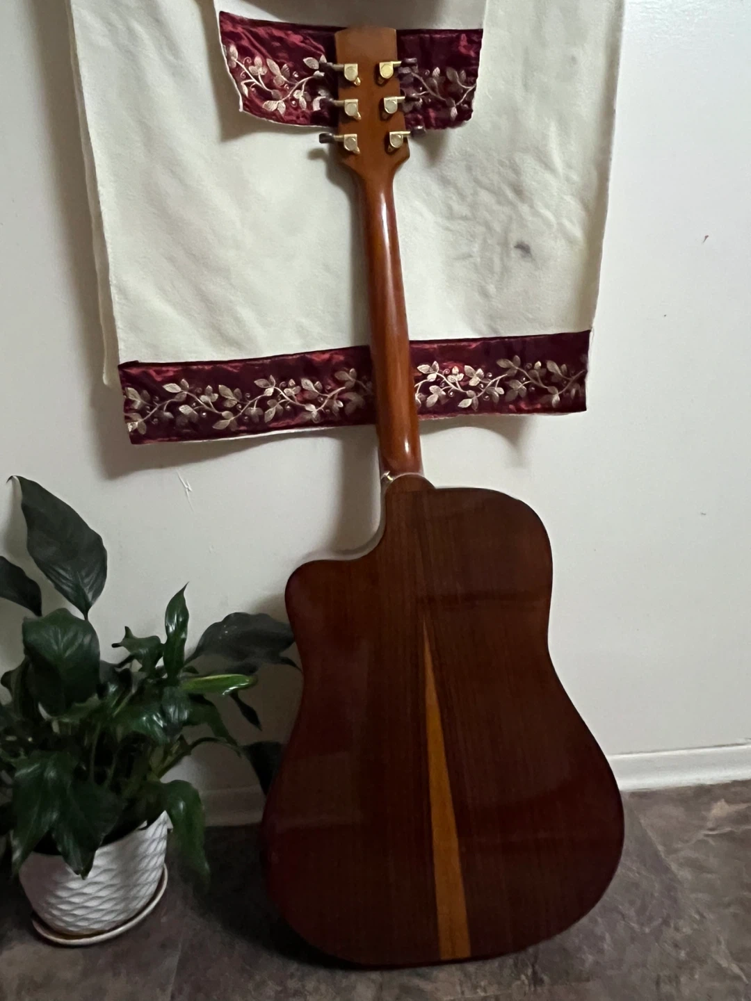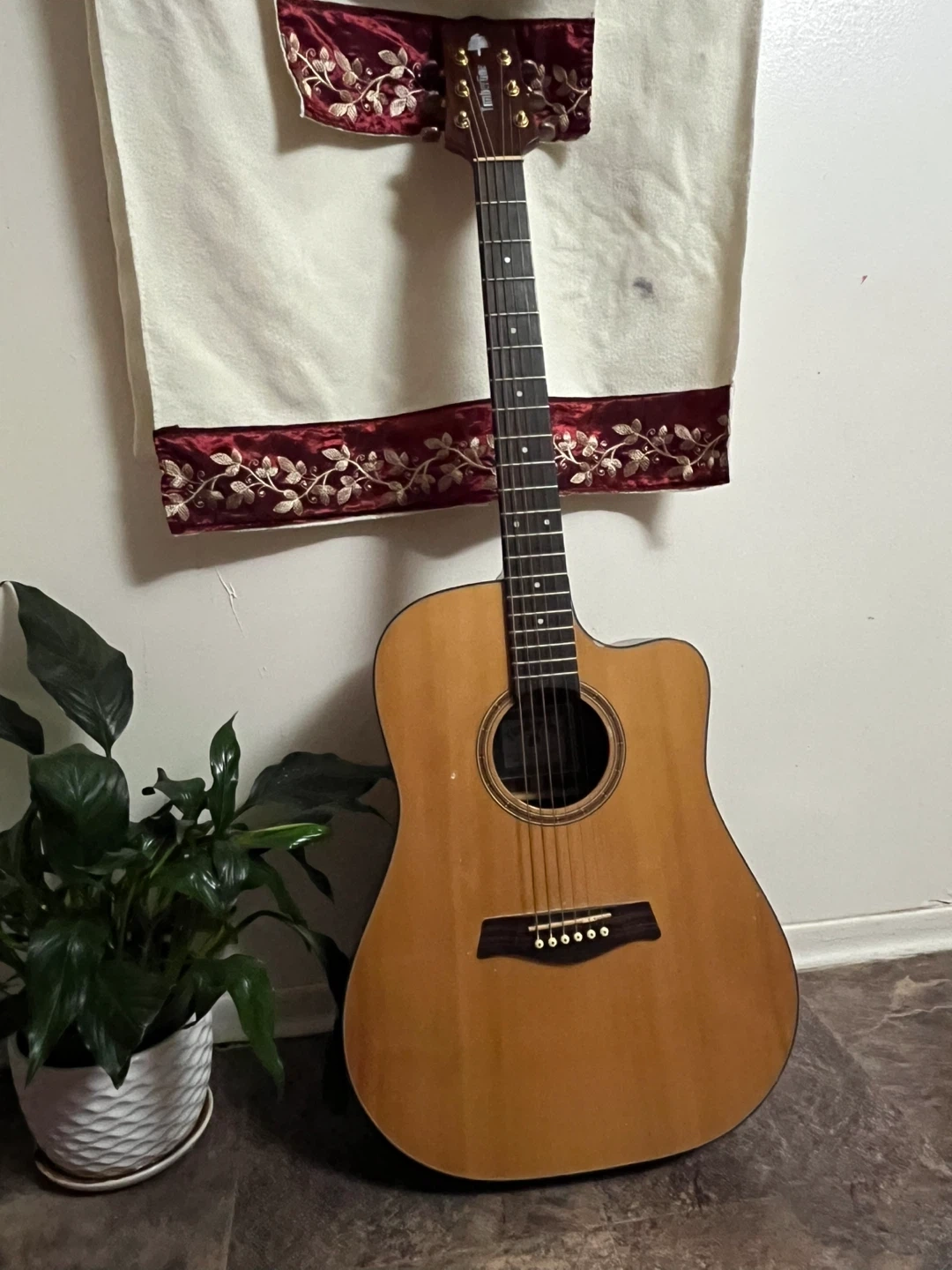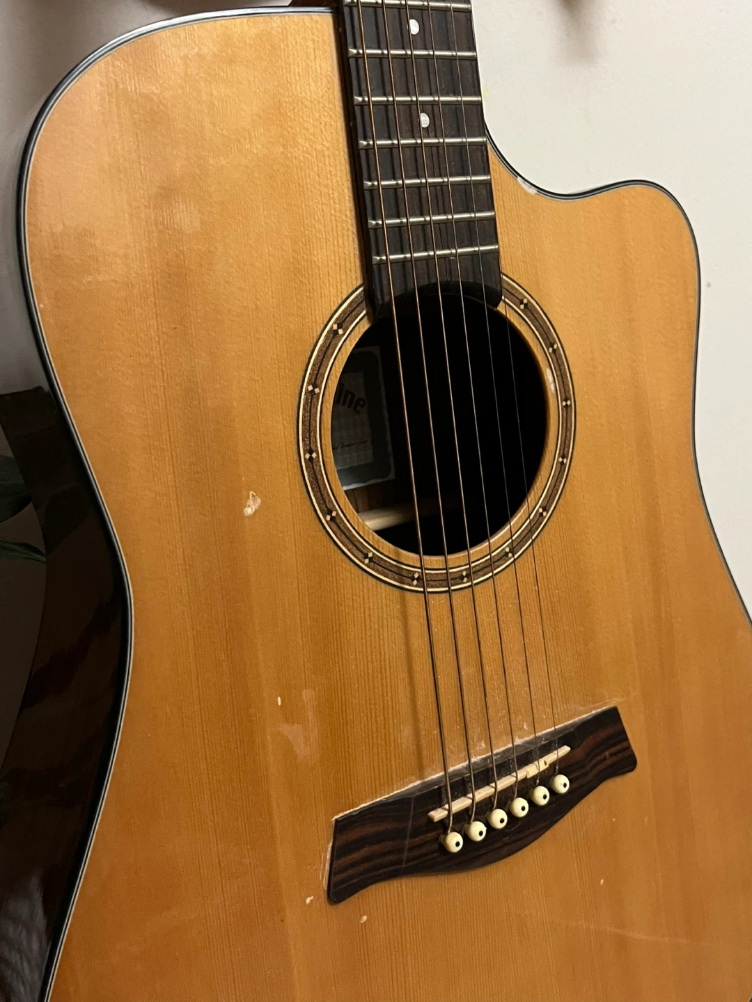 Acoustic guitar from Timberline. It has a cutaway body style and a natural wood finish. Six strings are present and the tuning pegs are gold-toned. Brand new, no damages and worth more then price listed