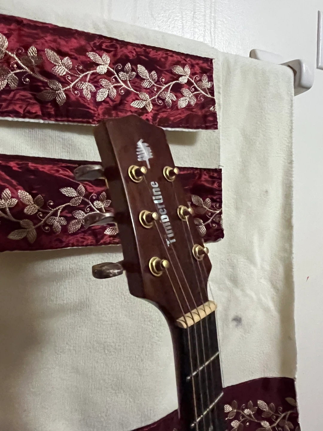Acoustic guitar from Timberline. It has a cutaway body style and a natural wood finish. Six strings are present and the tuning pegs are gold-toned. Brand new, no damages and worth more then price listed