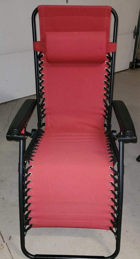 Set of two red zero gravity chairs. These chairs feature a foldable design for easy storage. Comfortable padded headrests included. They're great for relaxing on the patio or deck!