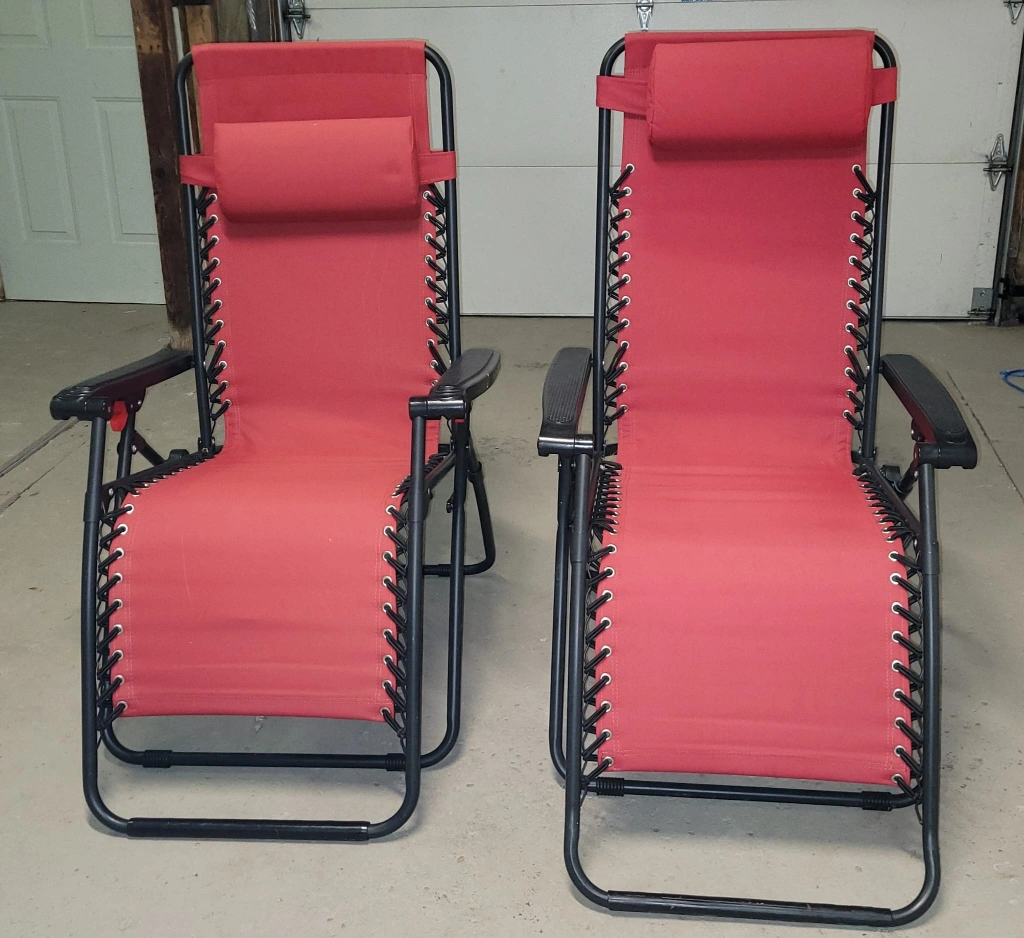 Set of two red zero gravity chairs. These chairs feature a foldable design for easy storage. Comfortable padded headrests included. They're great for relaxing on the patio or deck!