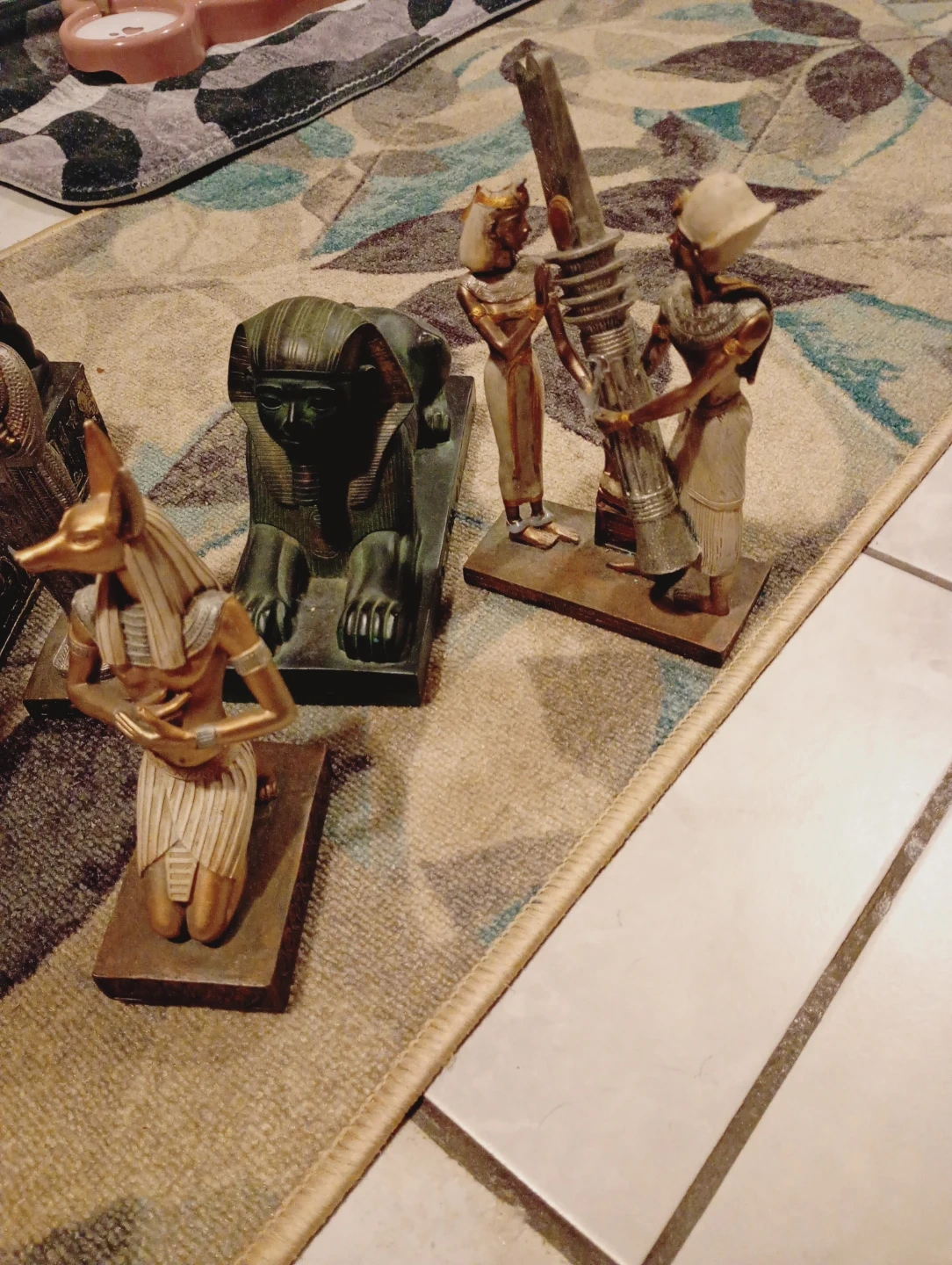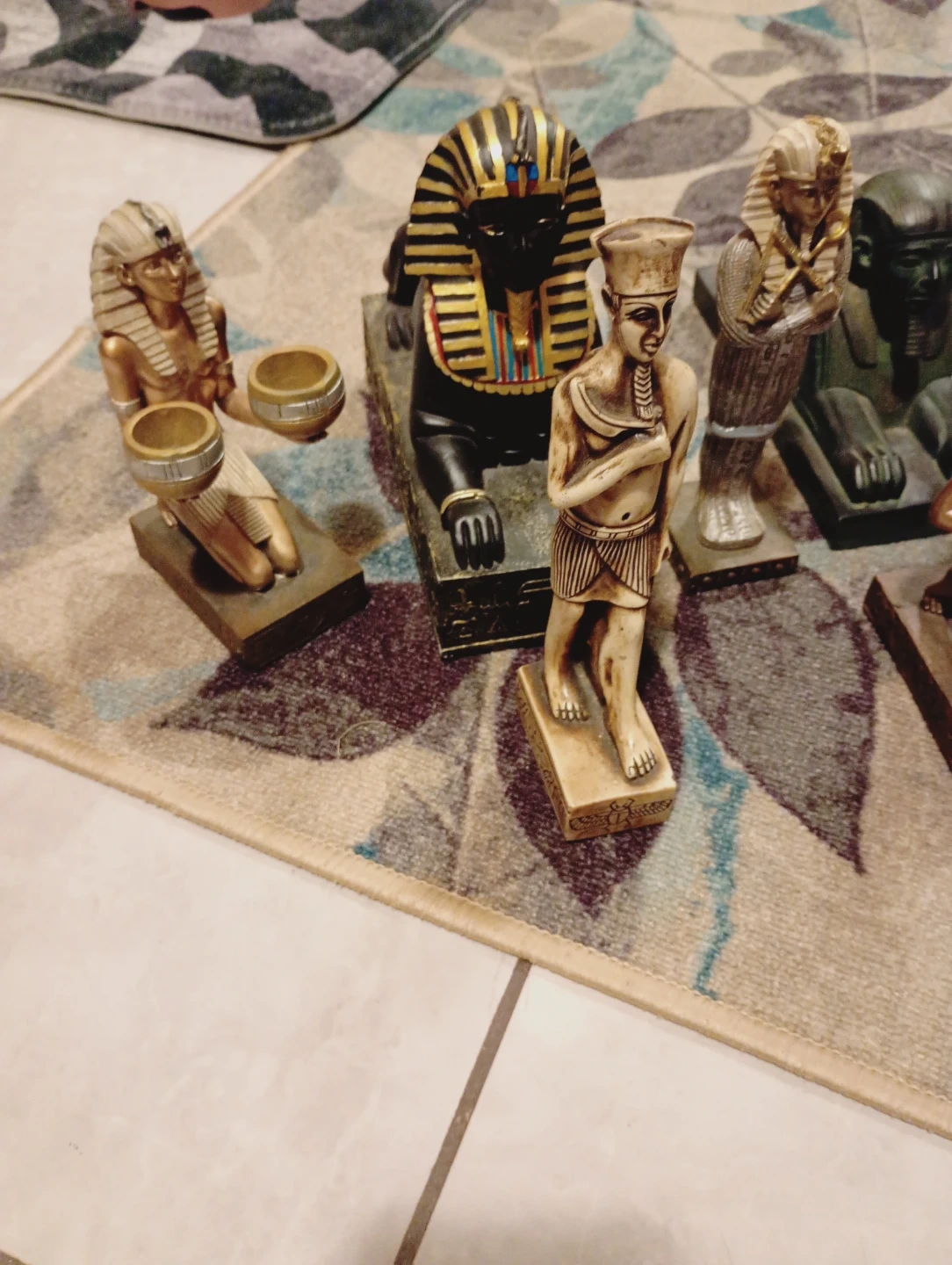 This set includes several decorative figurines inspired by ancient Egyptian culture. They're made from a durable resin material and showcase various pharaohs, gods, and mythical creatures. These pieces are great for display and adding a touch of historical flair to any room.