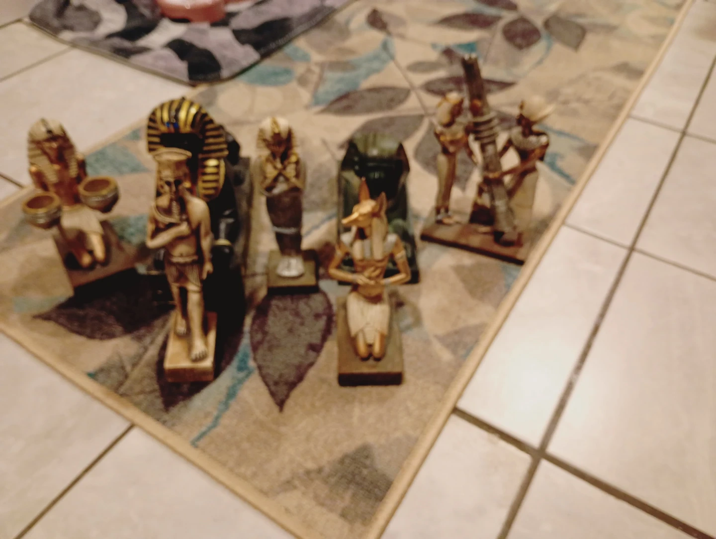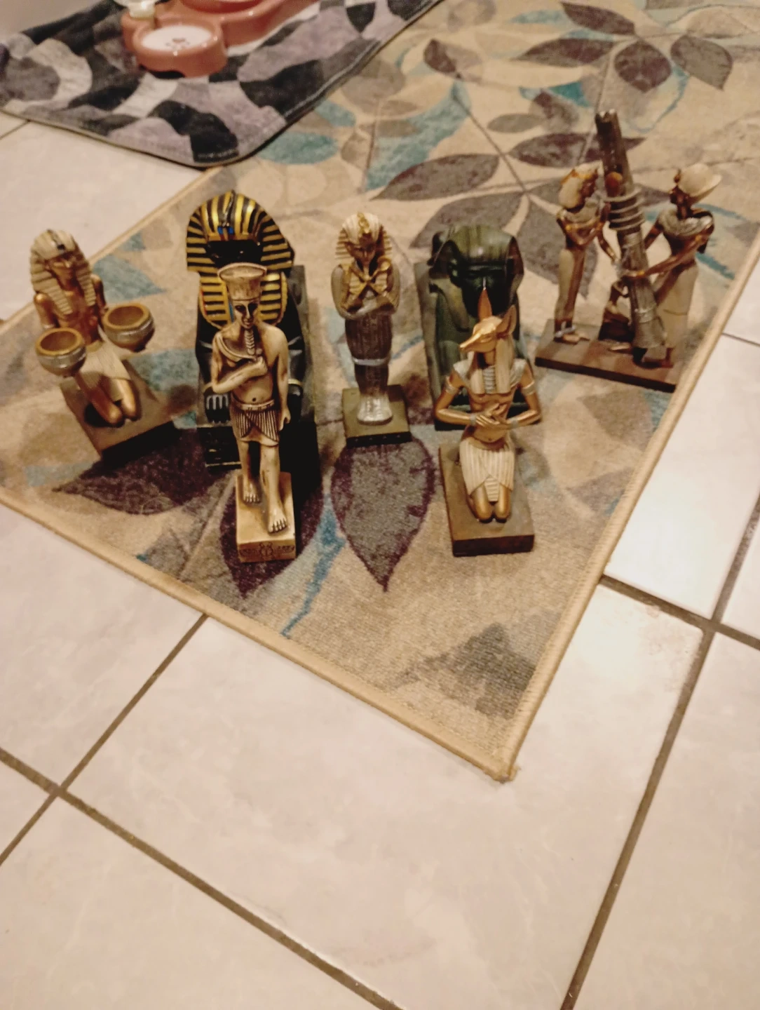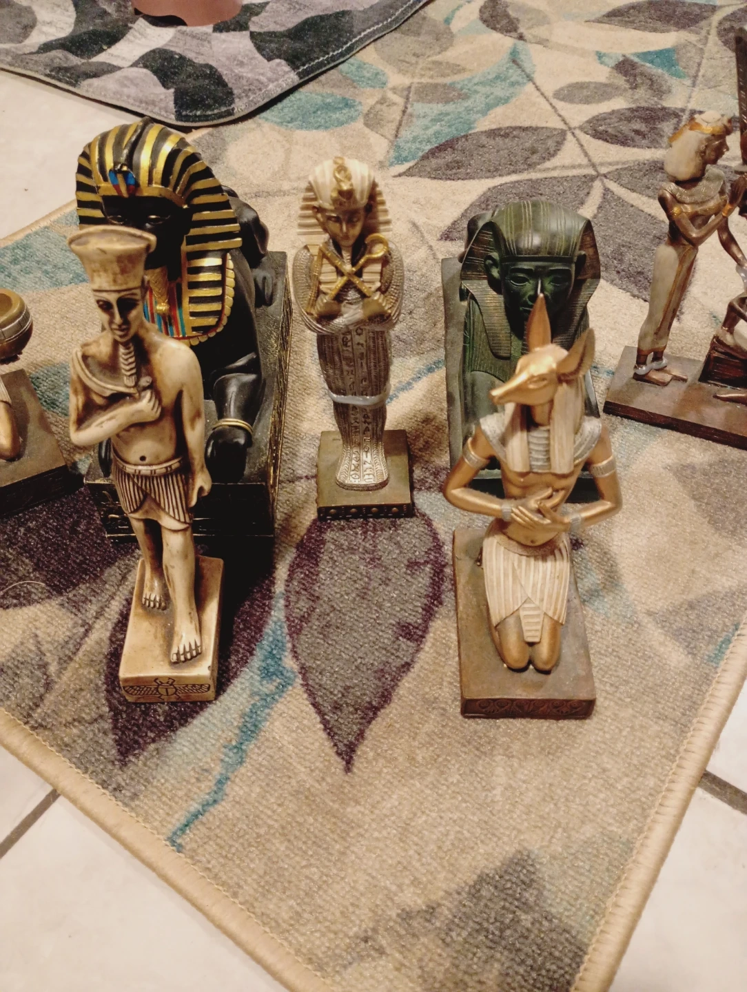 This set includes several decorative figurines inspired by ancient Egyptian culture. They're made from a durable resin material and showcase various pharaohs, gods, and mythical creatures. These pieces are great for display and adding a touch of historical flair to any room.