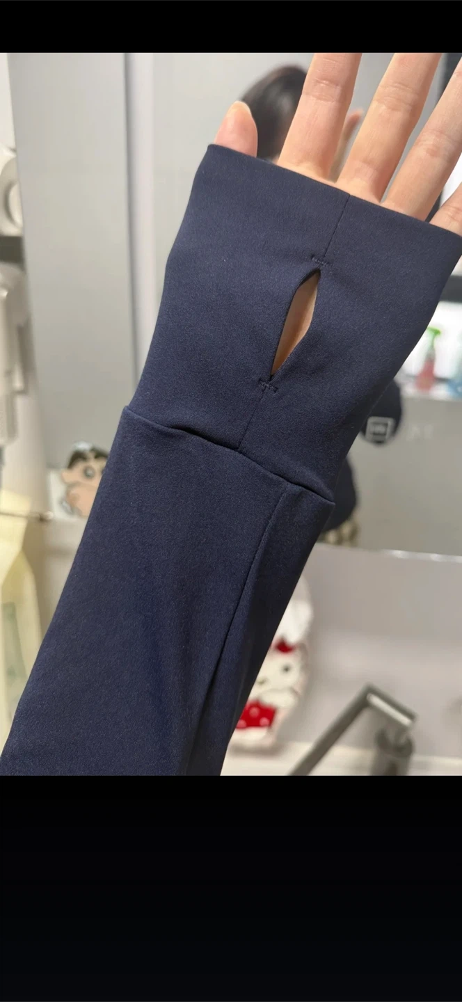This Lululemon jacket features a full zip closure and thumbholes for added convenience. It's made from a comfortable stretch fabric. It's great for layering during workouts or casual wear.
