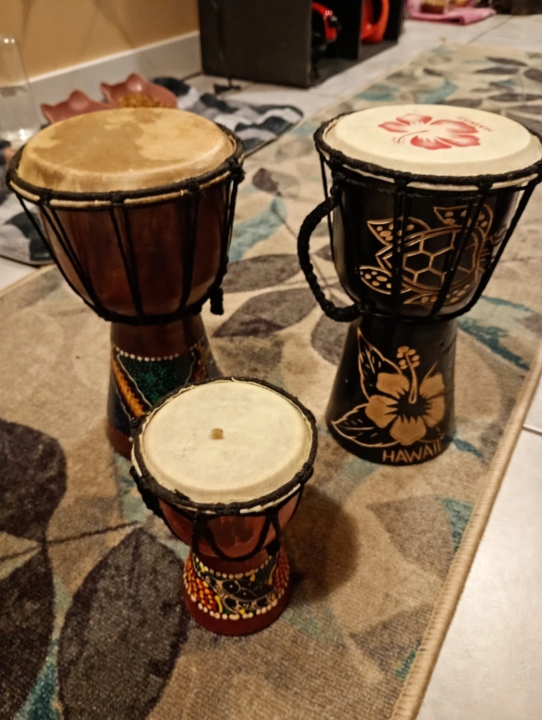 A set of three decorative djembe drums, with one featuring a Hawaii theme including a turtle and hibiscus design. The smallest drum has colourful tribal patterns. They're perfect for adding a touch of island flair to your decor or for casual drumming fun!