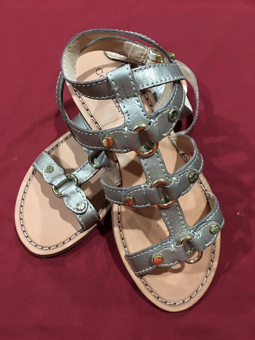 Cole Haan gold gladiator-style sandals for kids. These feature multiple straps and a secure buckle closure. Leather upper and sole. Perfect for warm weather adventures!